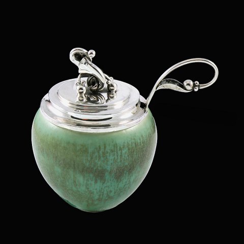 Saxbo - F. Hingelberg - Georg Jensen. Krukke i stentøj med låg og ske i Sterling Sølv.