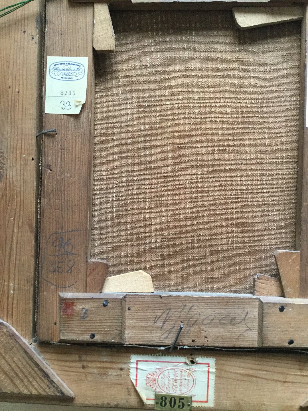 Flere auktionsmærkater/numre fra bl.a. Winkel & Magnussen og Bruun Rasmussen.