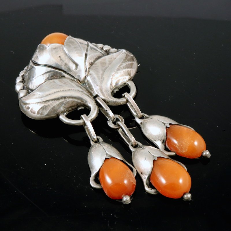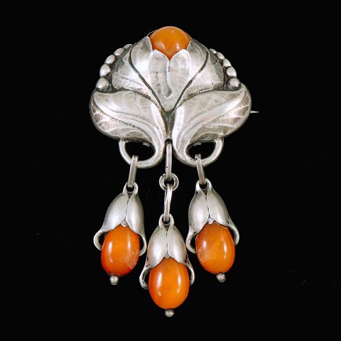 Evald Nielsen. Skønvirke Broche i Sølv med rav.