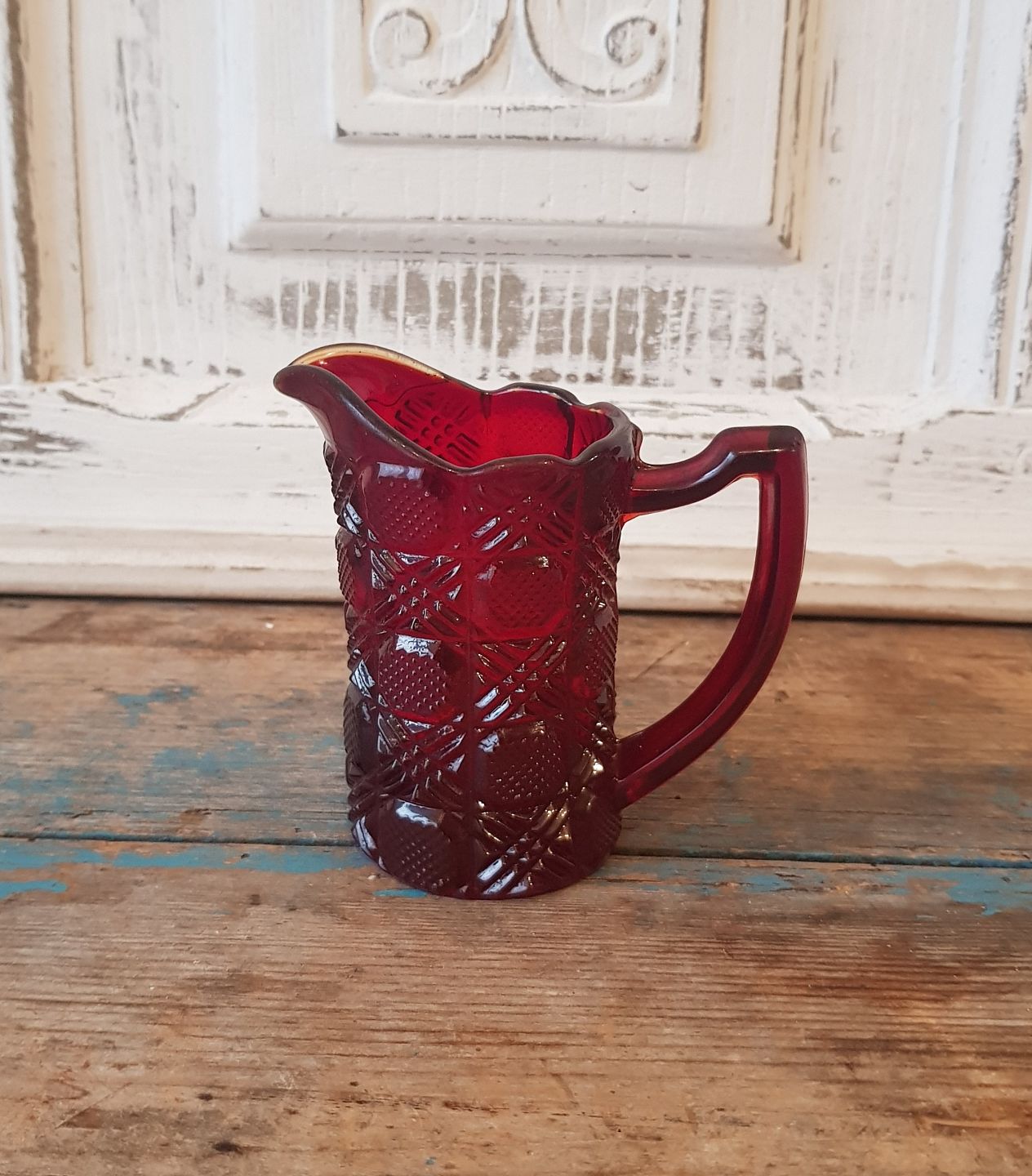 Flødekande i rødt presset glas fra Fyens Glasværk