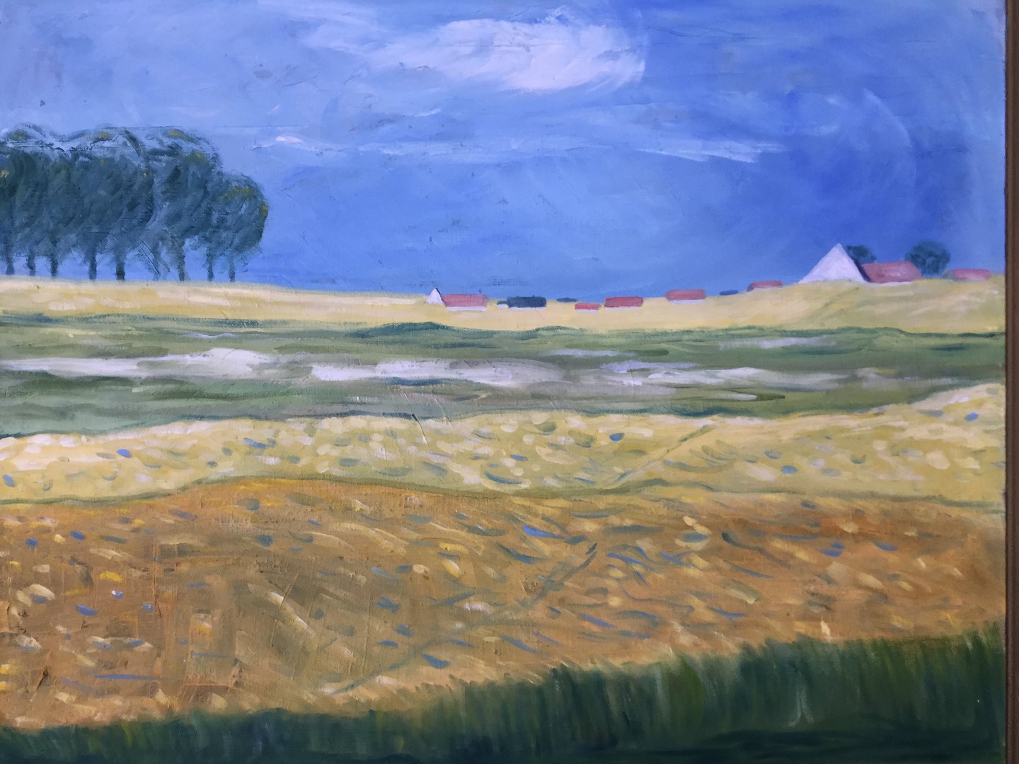 Sommerlandskab med gule kornmarker og by i baggrunden.