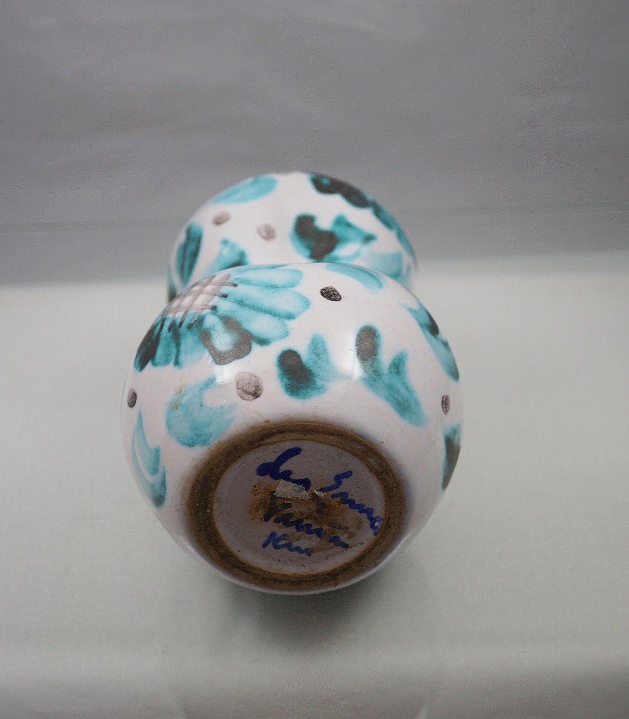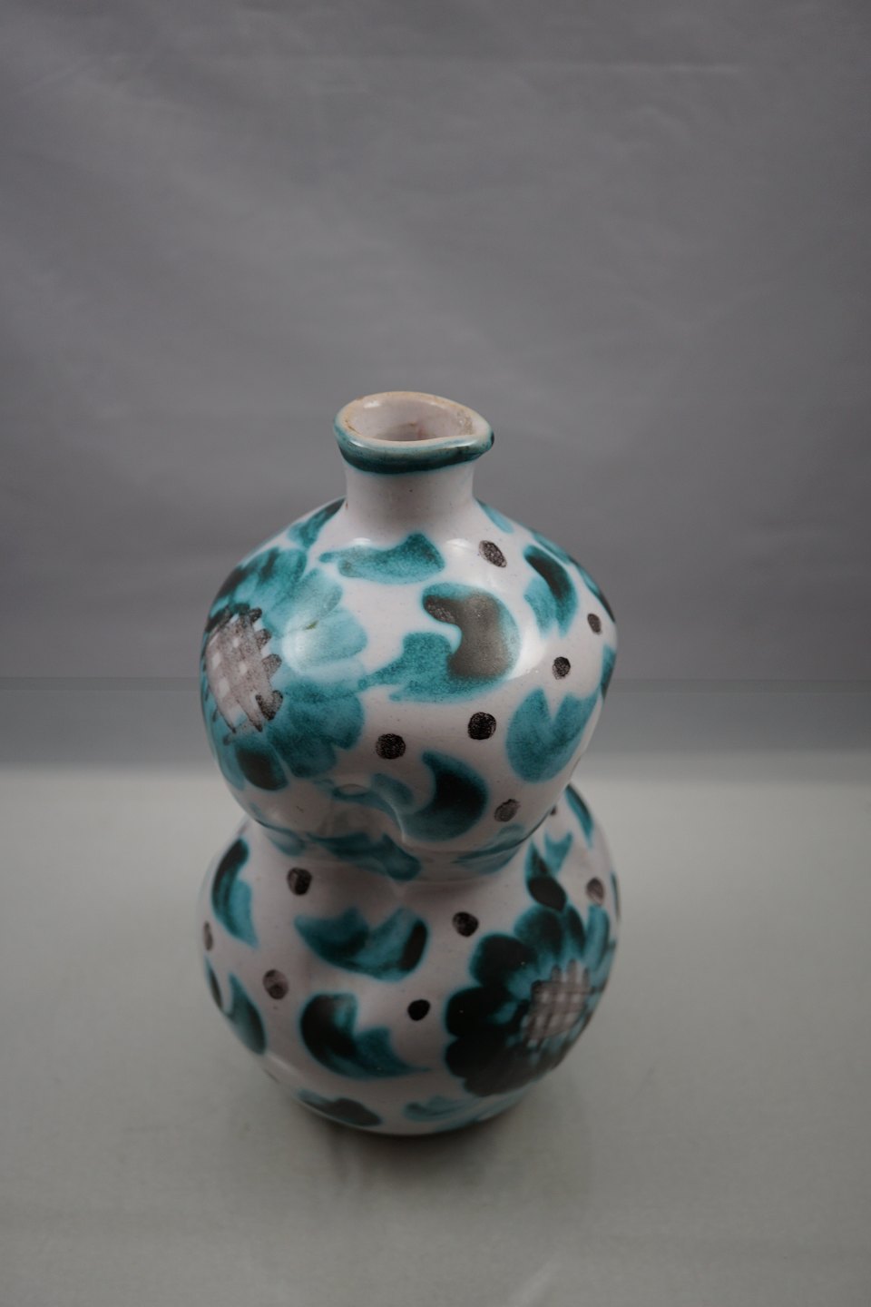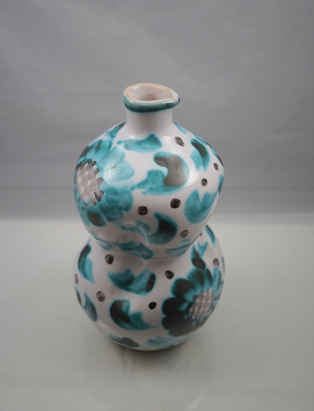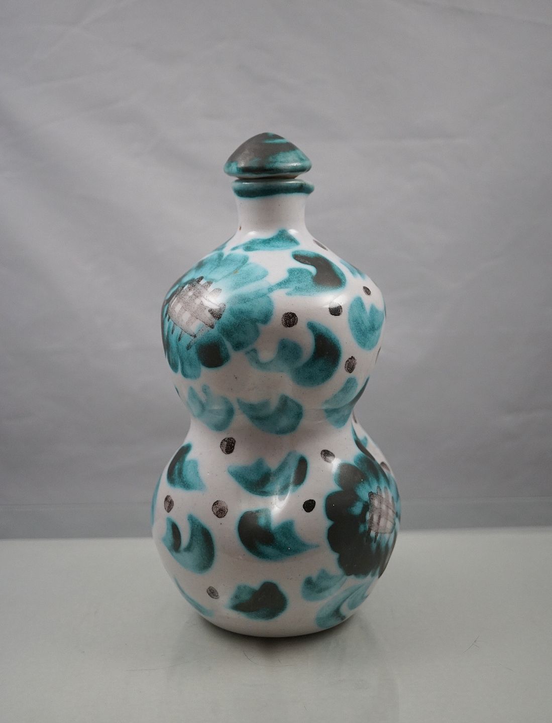 Leo Emma, keramik klukflaske, hvid glaseret med grønligt mønster. Flasken har keramik prop