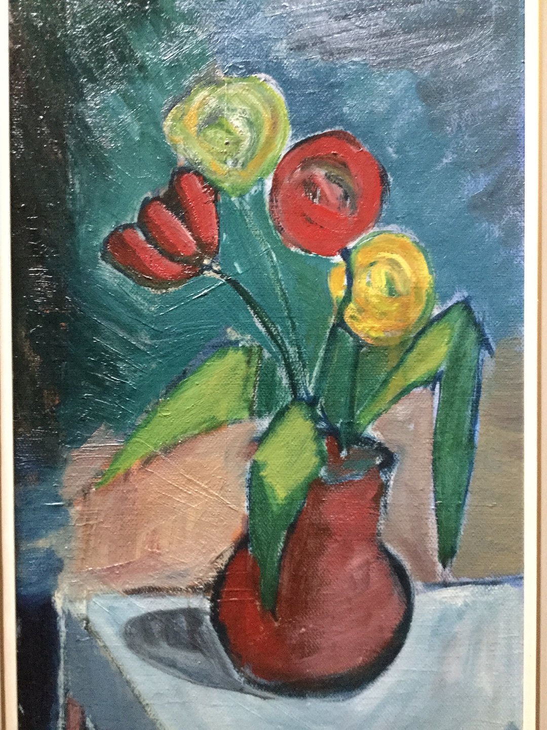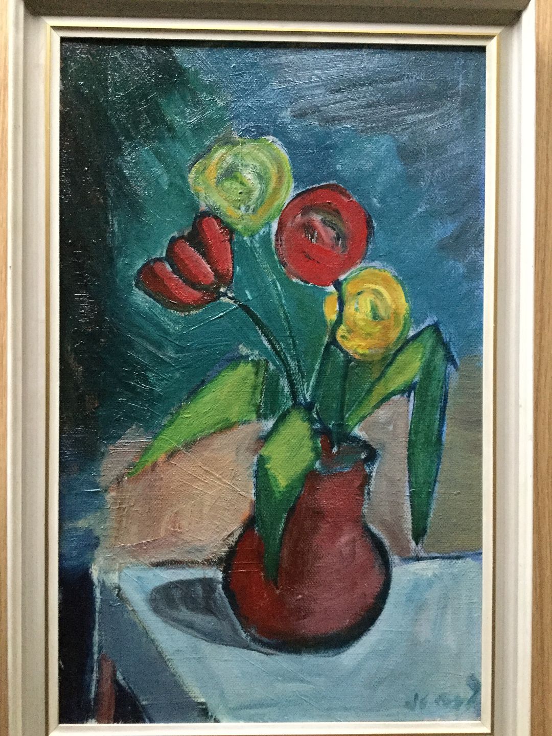Maleri af Jens Sørensen - Tulipaner i vase på bord.