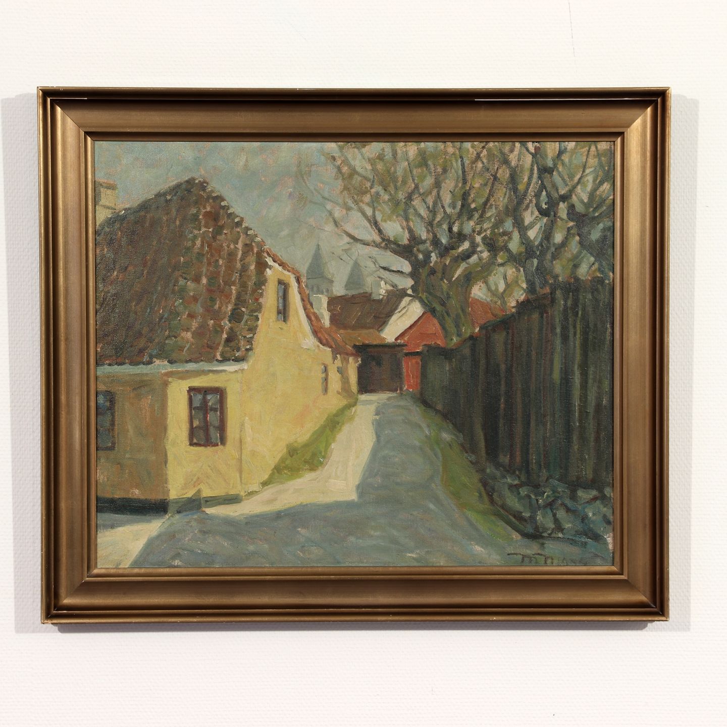 Byparti, olie på lærred i forgyldt ramme, (HxB 42x83 cm), signeret