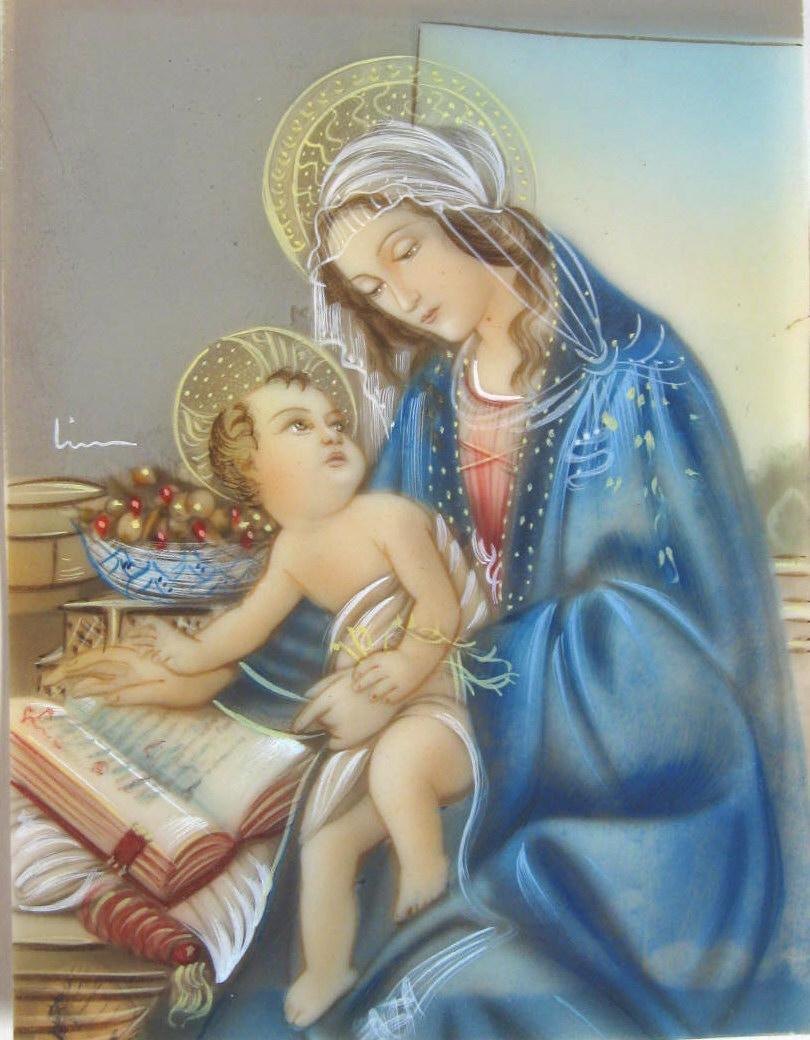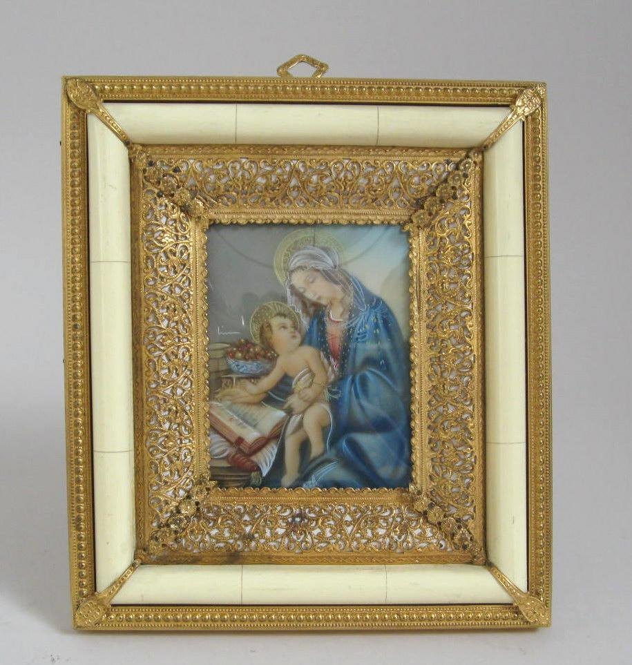 Ubekendt kunstner (20. årh): Madonna og Jesusbarnet. Miniature maleri. Olie på folie. Signeret. 9 x 6,5 cm.