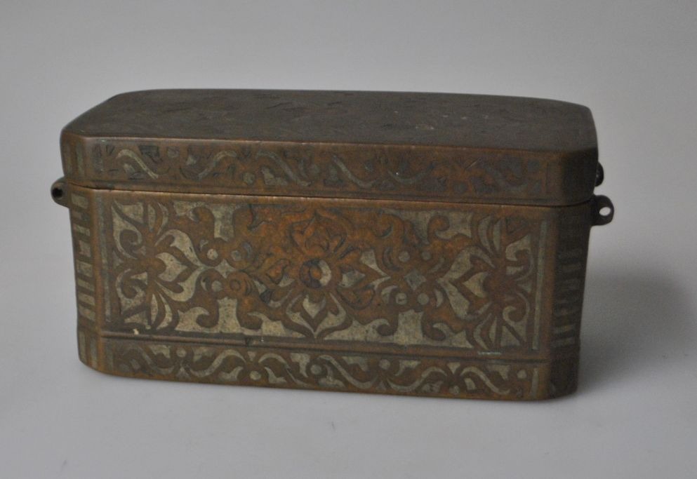 Bronze skrin, 8 kantet, 18./19. årh. Med sølv indlægninger. Indvendig 4 rum, hvoraf et er benyttet til læsket kalk. L.: 15 cm. B.: 7 cm. H.: 7,5 cm.