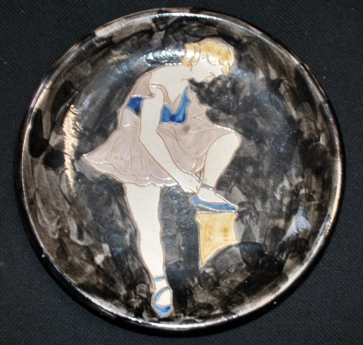 Humlebæk dish in ceramics, 20th century Denmark. Decorated with ballet girl wearing shoes. Glazes in black, red, yellow and blue. Dia: 25.5 cm. Unsigned.