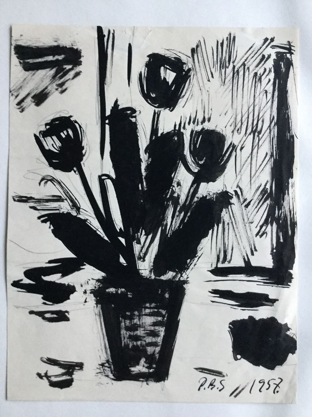 Tegning af Peder Brøndum Sørensen- Tulipaner i vase 1957.