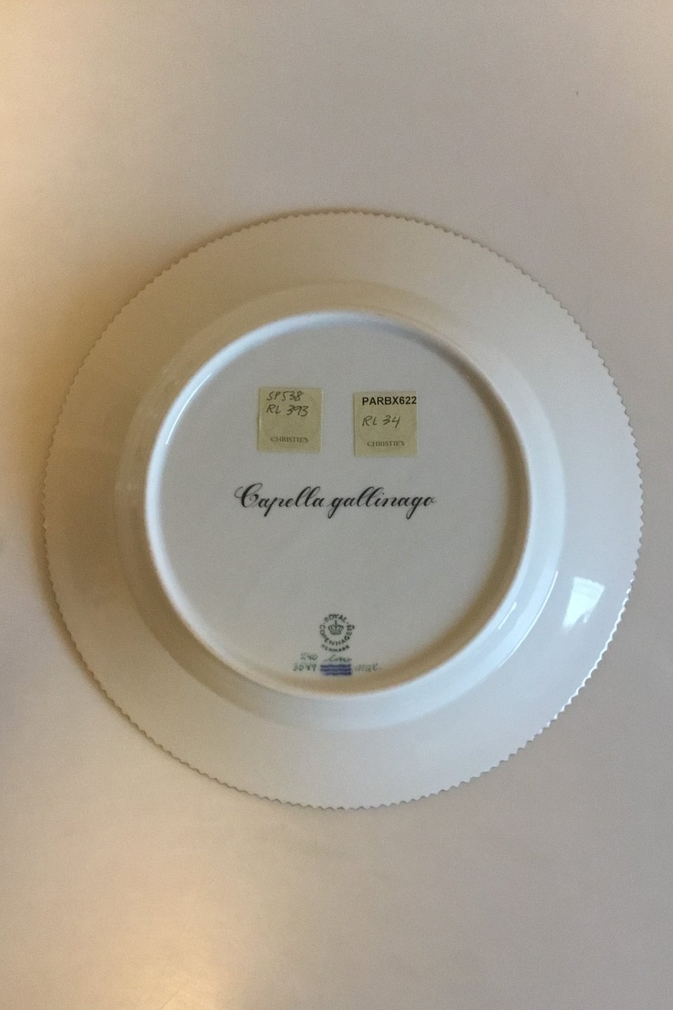 Royal Copenhagen Flora Danica Fuglestel Middagstallerken No 240/3549. Latinsk navn: Capella gallinago. Måler 25,5 cm Afslag på en tak
