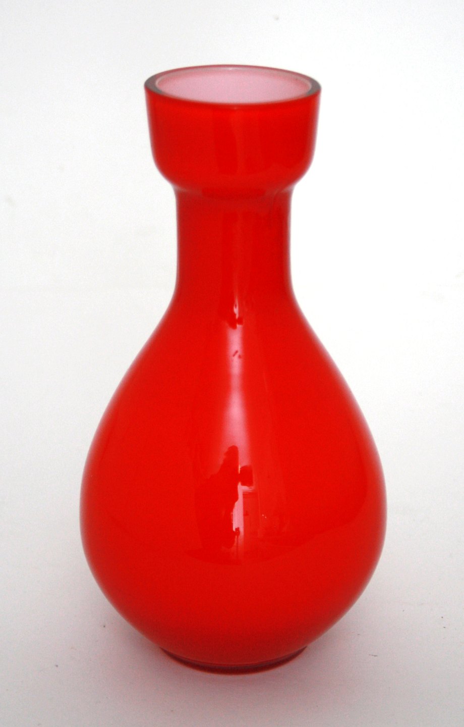 Elme/Bergdala glasbruk, Carita/Catinka vase i rød overfang og hvid indvendig. Designet af Carl-Olof Borgarp i 1960'erne. Højde 18,5 cm. Diameter 9 cm. Pris: 275 kr.
