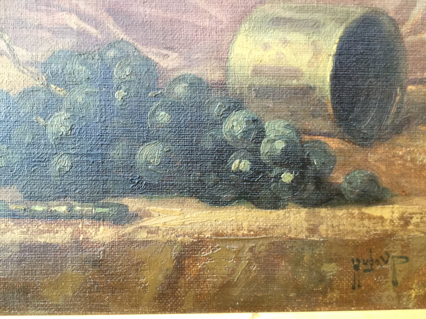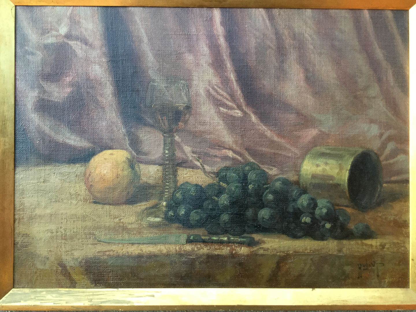 Text available in Danish: Maleri af Hugo V. Pedersen - Stilleben med vinglas, druer og æble.