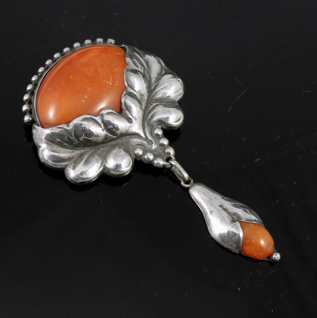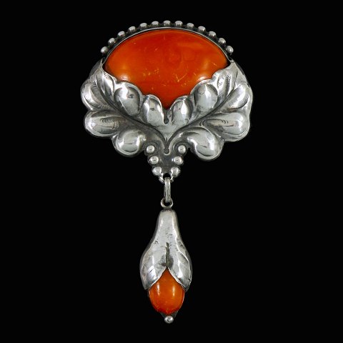 Evald Nielsen. Skønvirke Broche i Sølv med rav.