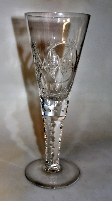 Glass cup, approx. 1910, Denmark. With numerous grinding and the monogram: AC. Height: 28 cm.