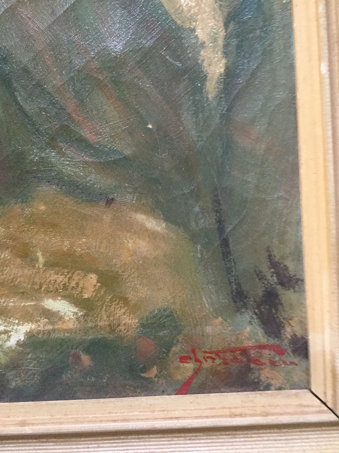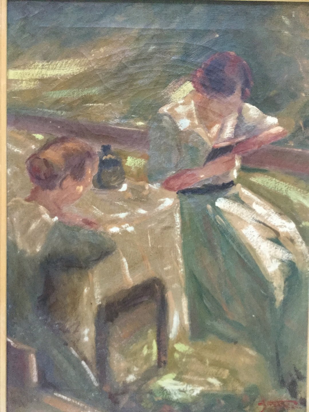 Maleri af Chr. Faber - læsende mor og barn ved havebord.