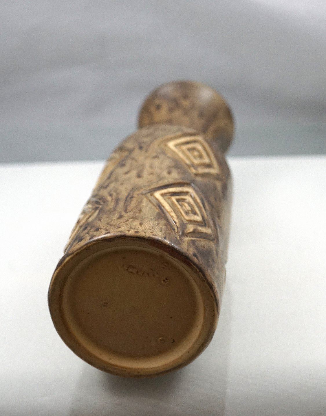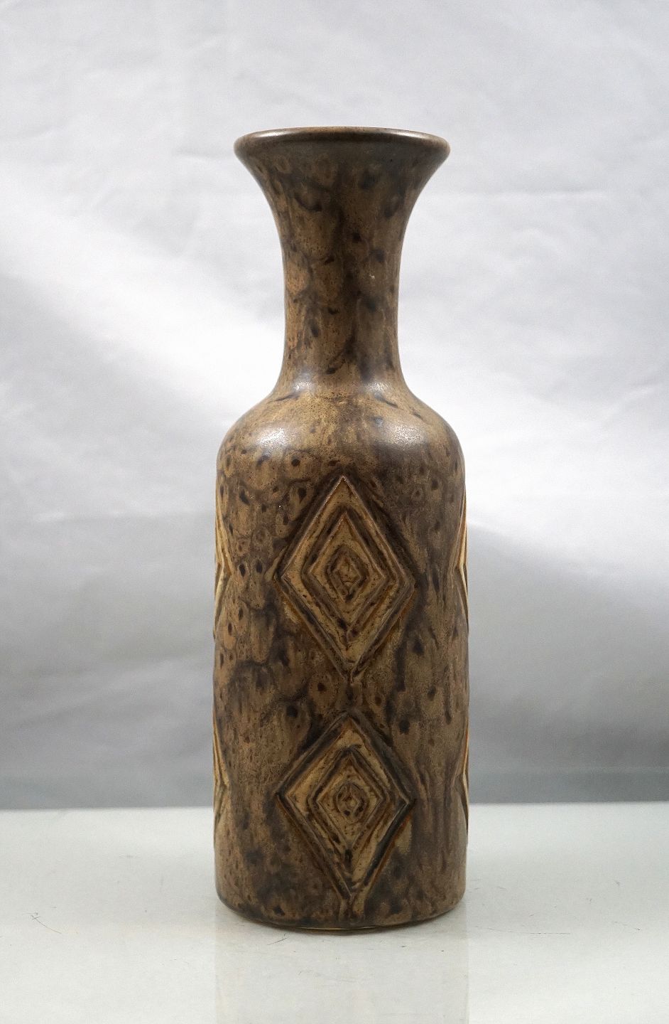 Løvemose Brun keramik vase, med brunt glasur, dekoreret med romber og vasen har udsvejet hals
