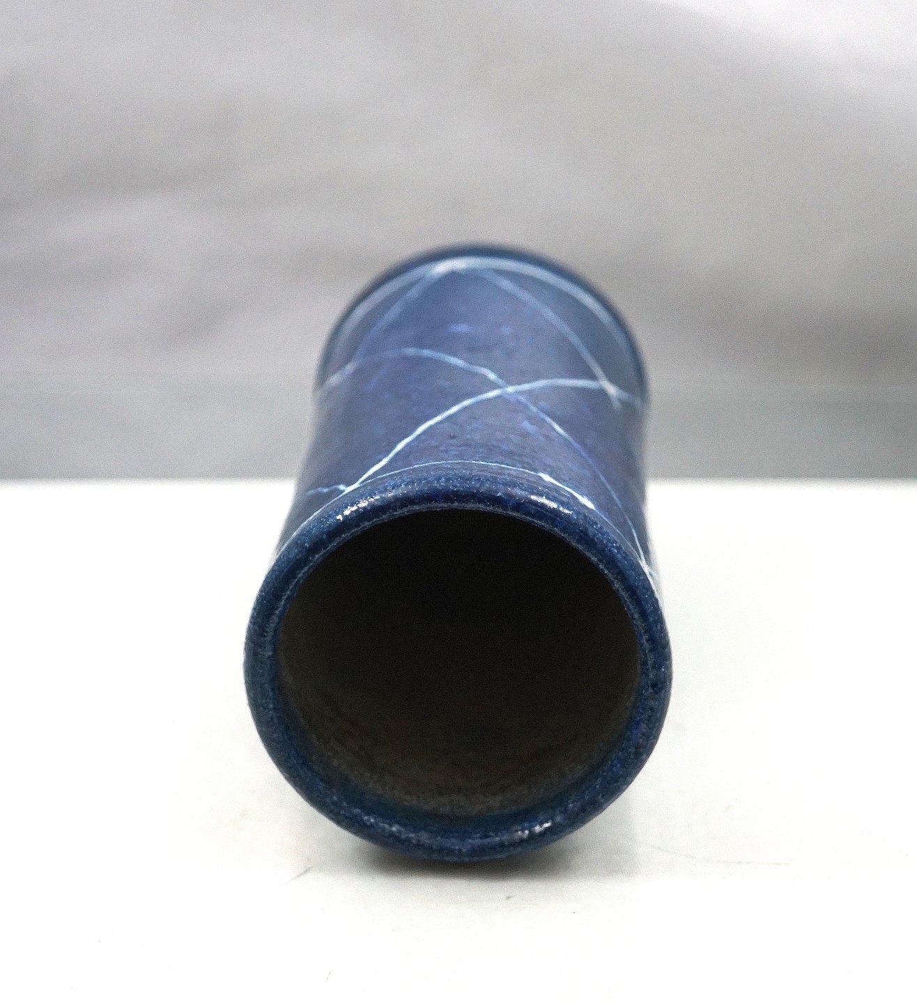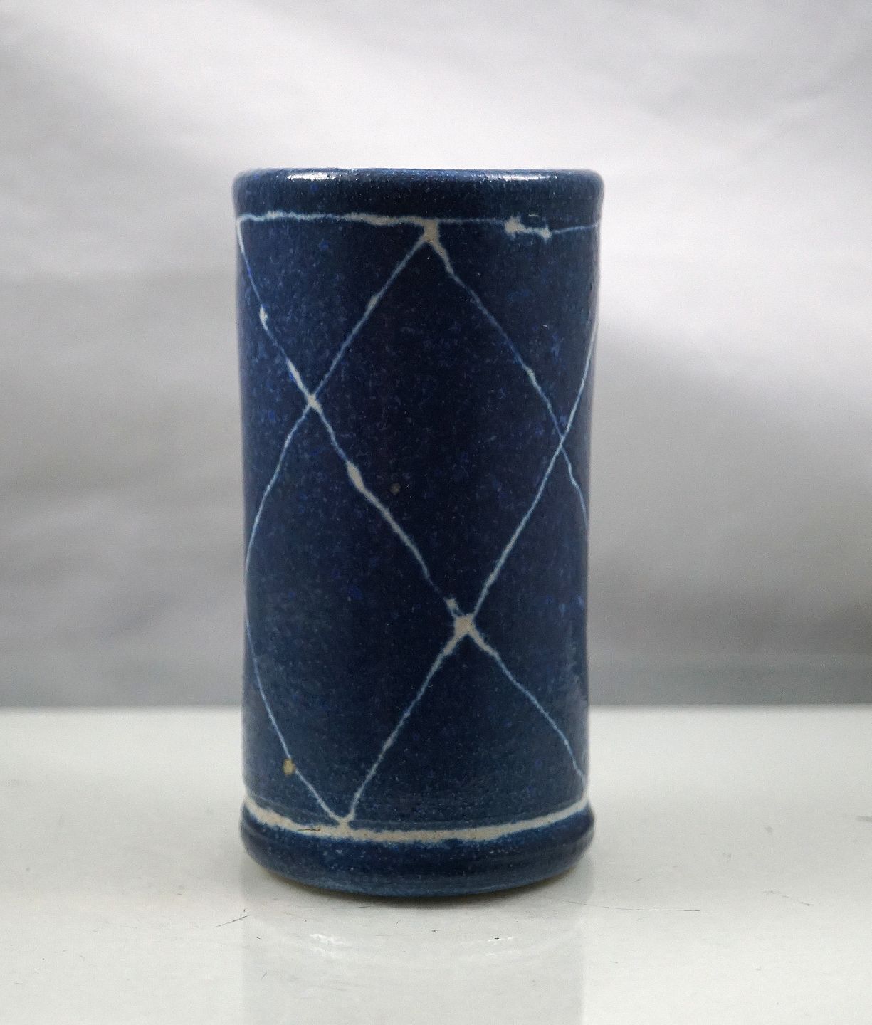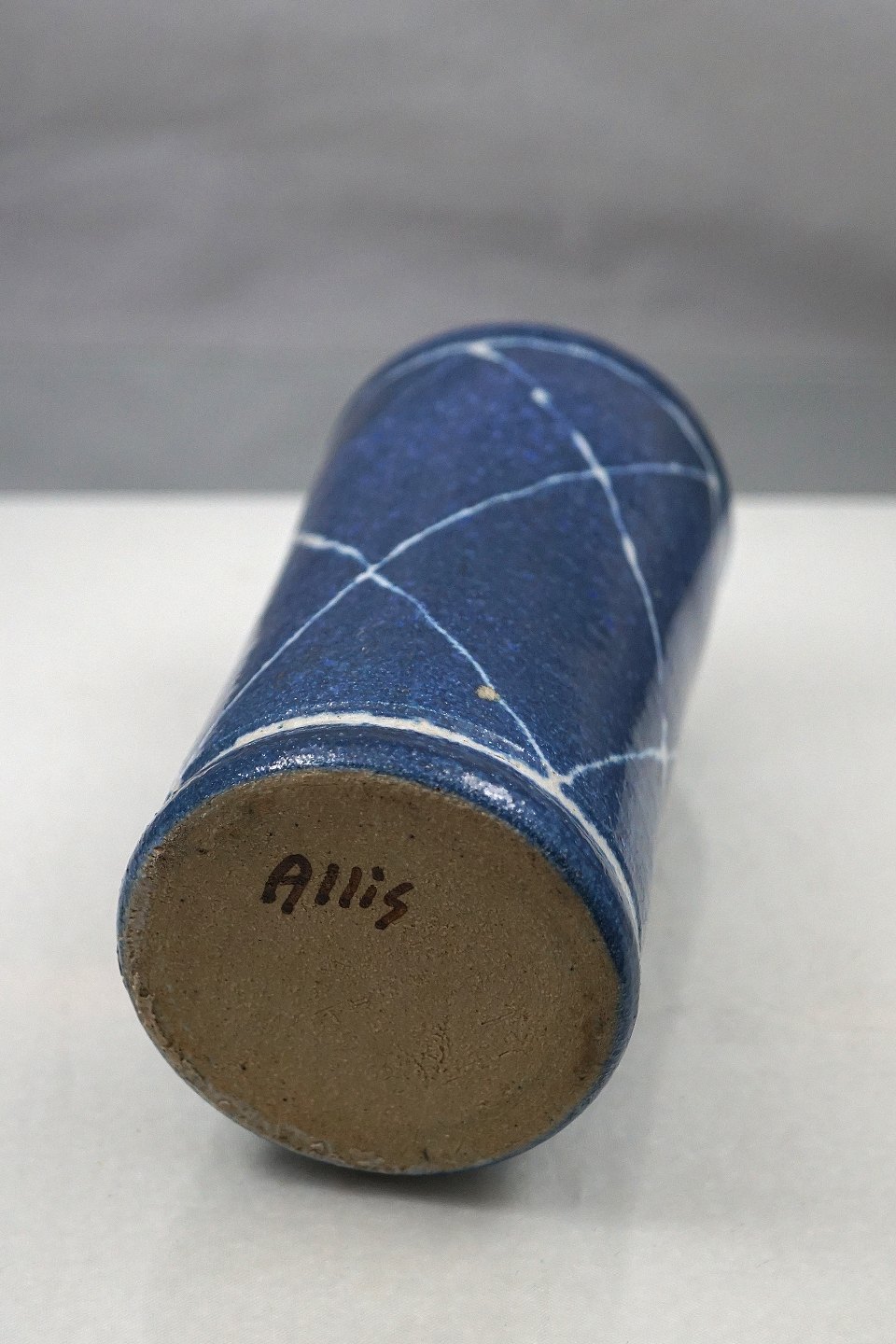 Allis. Blå keramik vase, der er dekoreret med hvide striber, der danner romber.