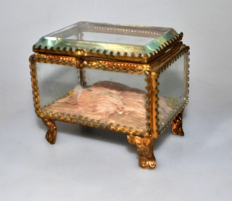 Smykkeskrin ca. 1900. Frankrig. Med facetteret glas og dekoreret messing rammer og fire ben. 6,5 x 7 x 8,5 cm.