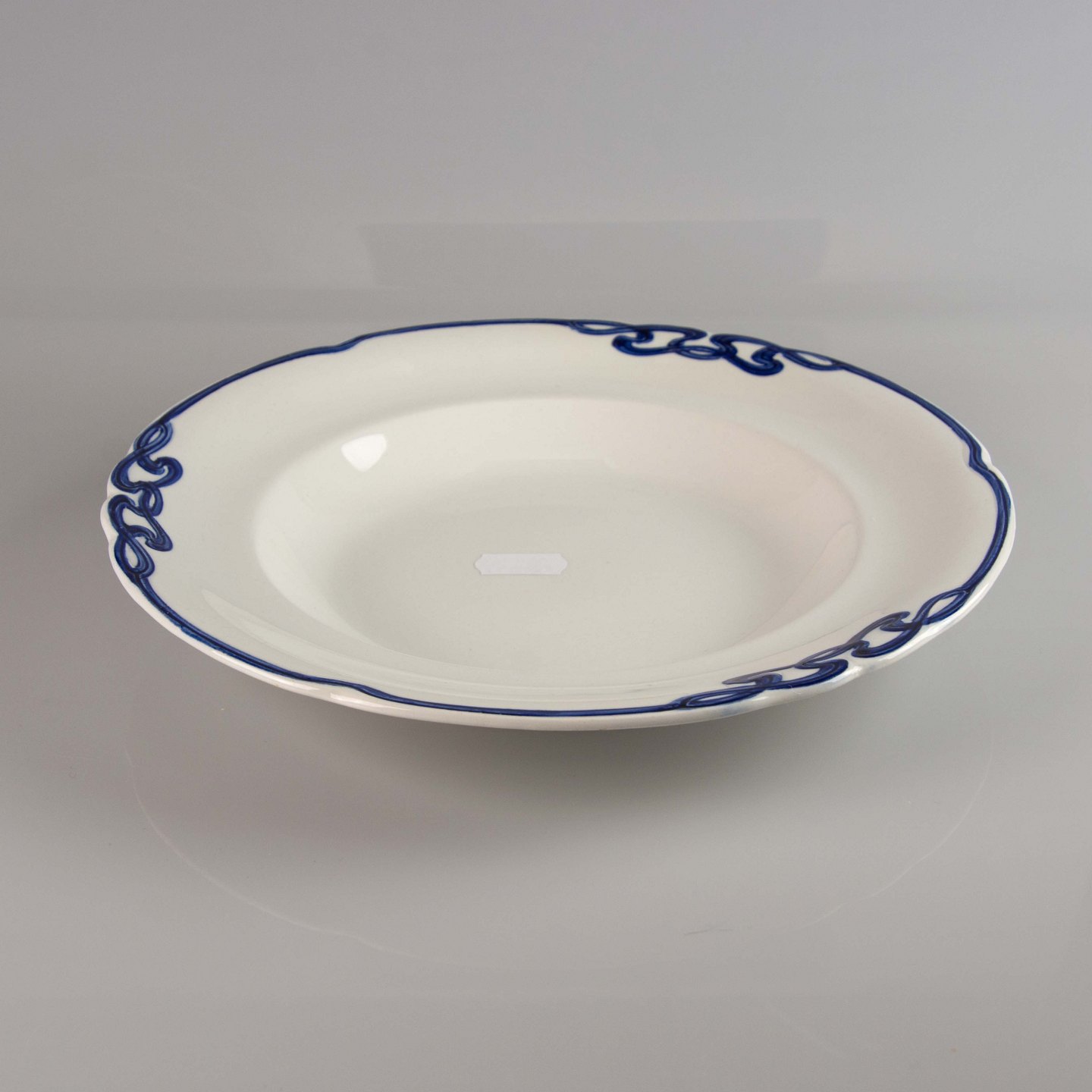 Tallerken i hvid fajance med dekoration af blå abstrakt mønster langs kanten.