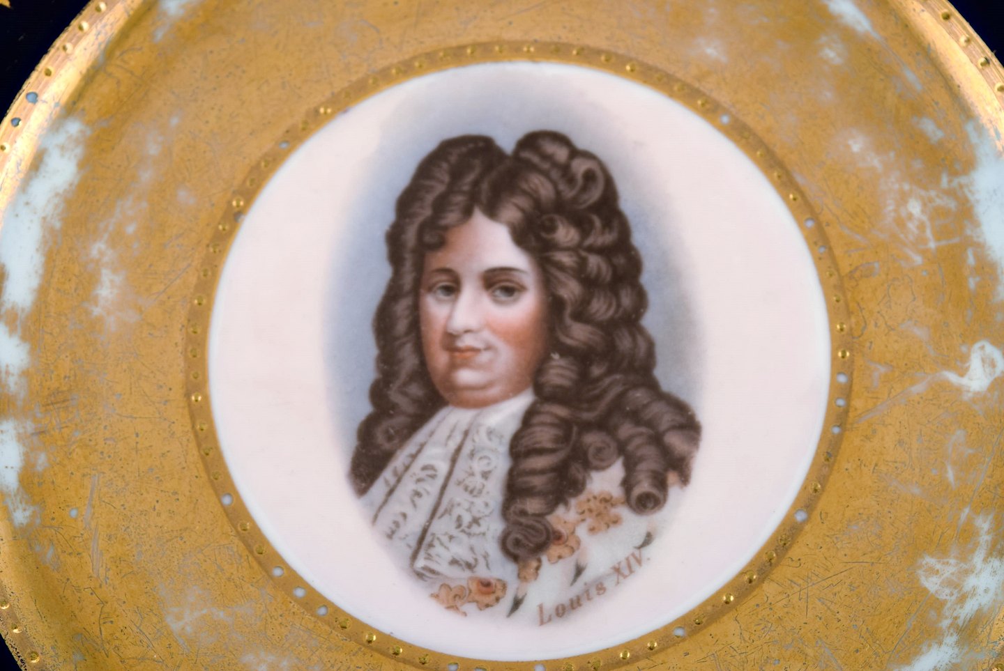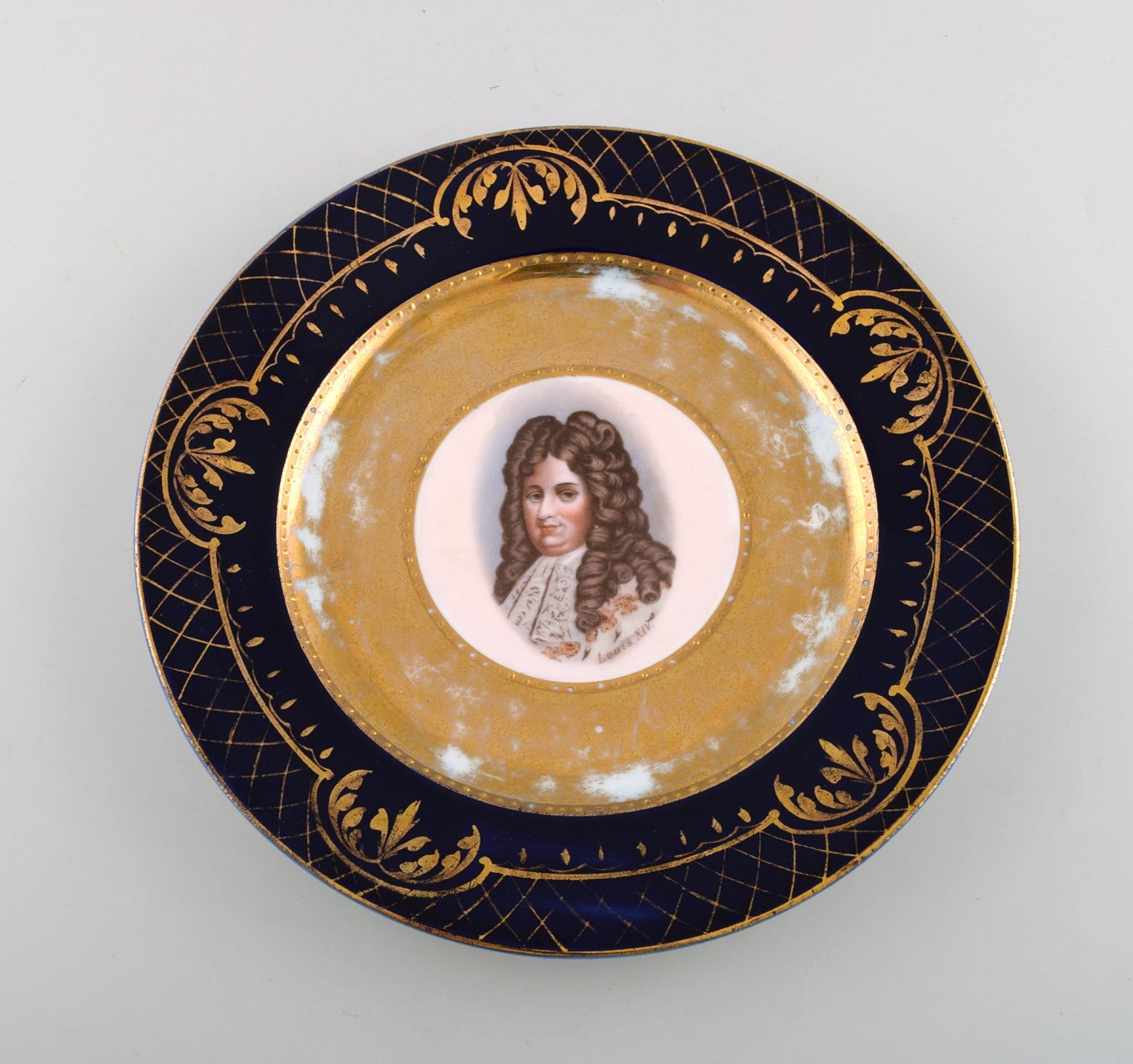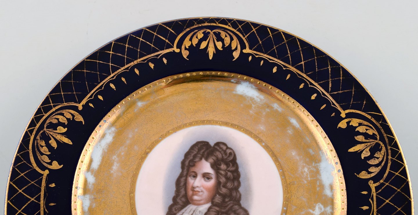 Two decorative plates in hand-painted porcelain with gold decoration. Motifs of Louis XIV and Madame Récamier. Vienna, circa 1900.