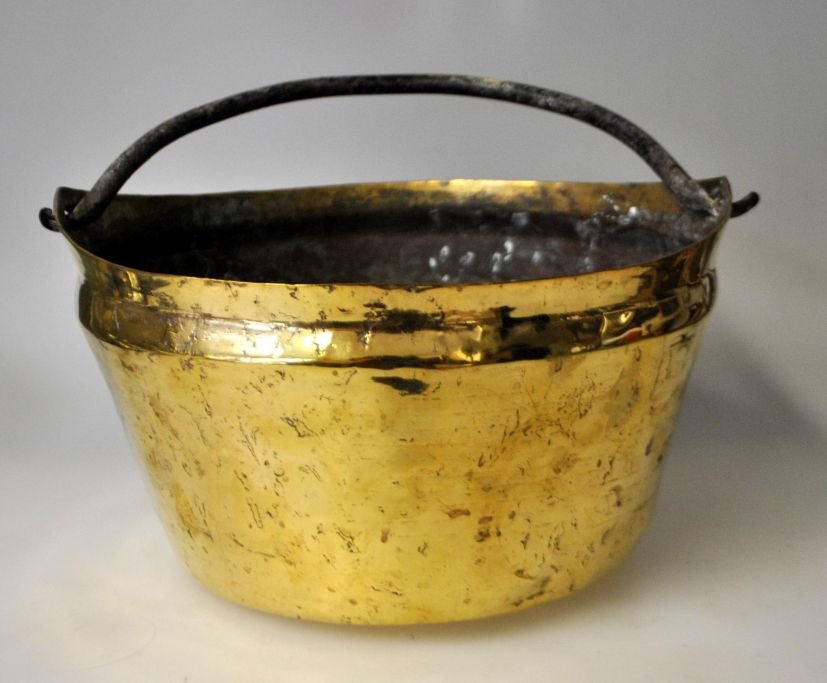 Flensborg spand, 19. årh. Danmark/Tyskland. Messing med jern hank. H.: 13,5 cm. Dia.: 22,5 cm. Højde med hank: 22 cm.