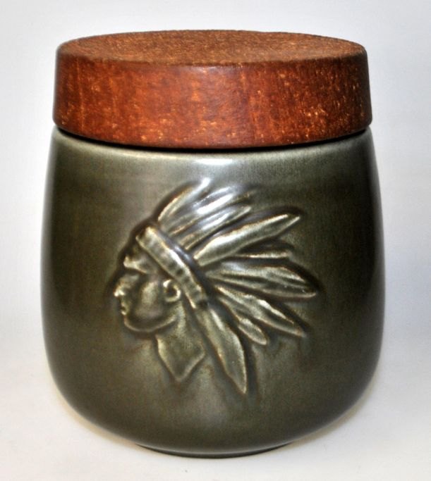 Søholm keramisk tobakskrukke, no. 355, 20. årh Danmark. Dekoreret på siden med indianer og piber. Grønlig glaseret. Med korklåg. Stemplet. Højde med låg: 15 cm.