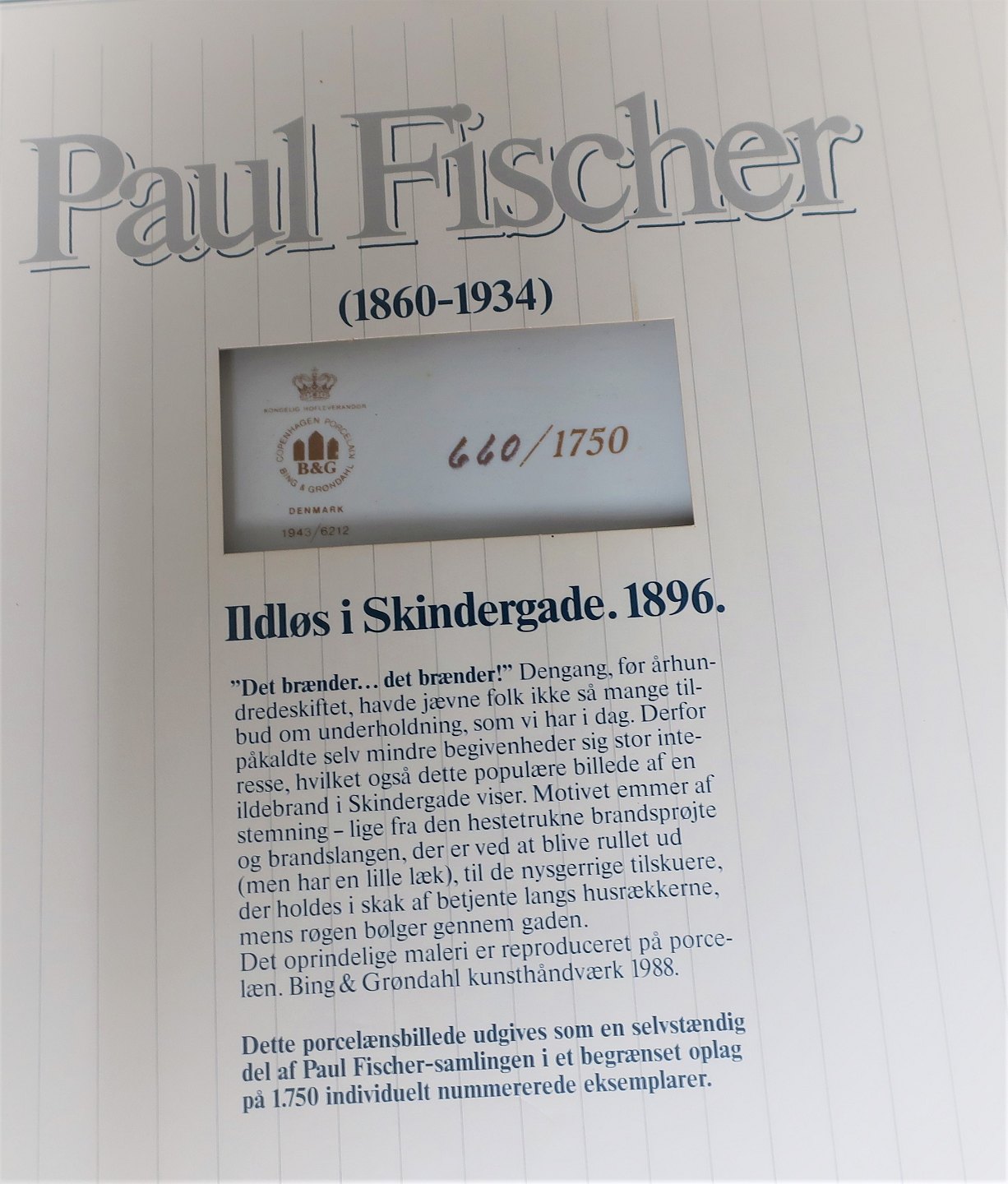 Bing & Grondahl. Porcelain painting. Motif by Paul Fischer. Fire in Skindergade. Size inclusive frame, 40 * 33 cm (small chip in the frame). Produced 1750 pieces. This has number 660.