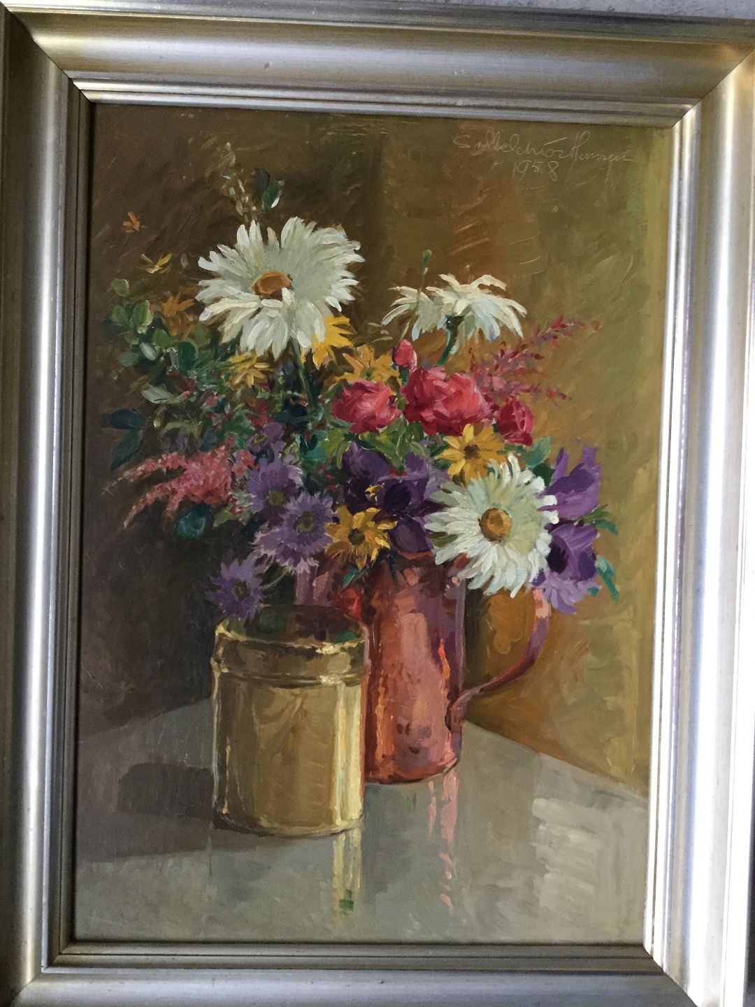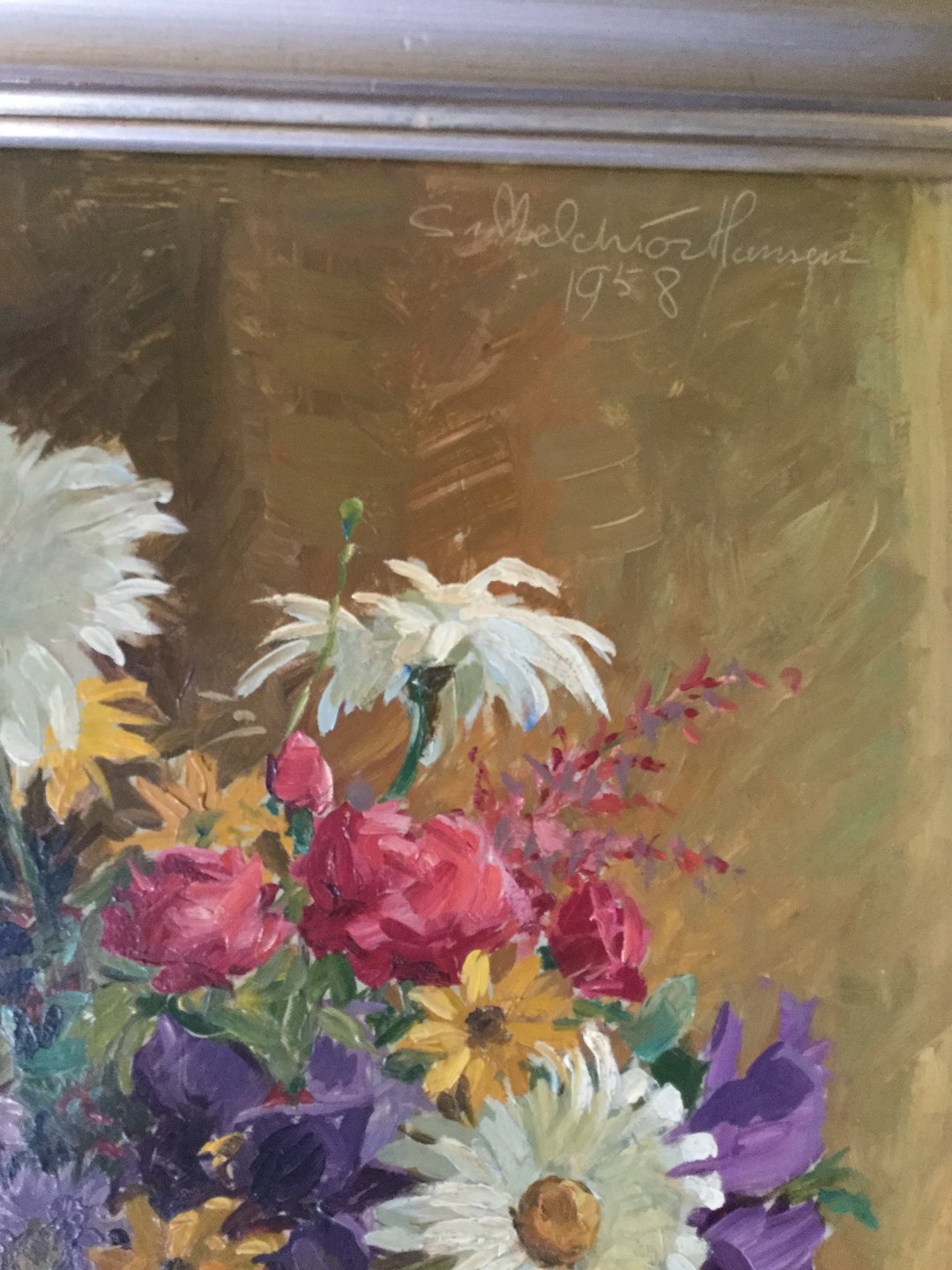 Text available in Danish: Maleri af Svend Melchior Hansen - Opstilling med blomster mv. 1958.