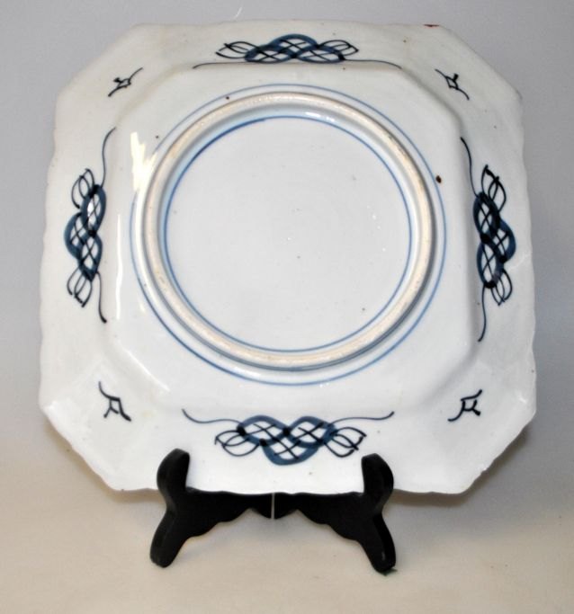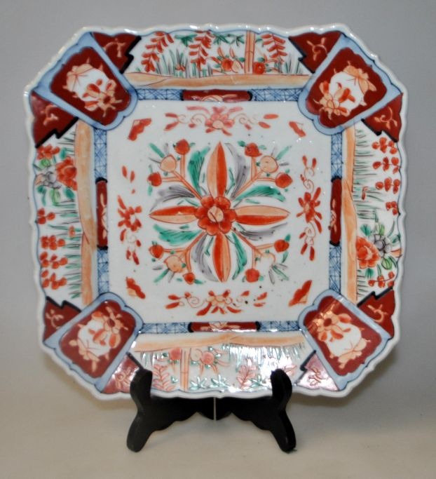 Japansk imari porcelæns fad,19. årh. 8 kantet, håndbemalet, polykrom dekoration med vegetation. Bølget kant. På undersiden blåmalet. 25 x 25 cm.