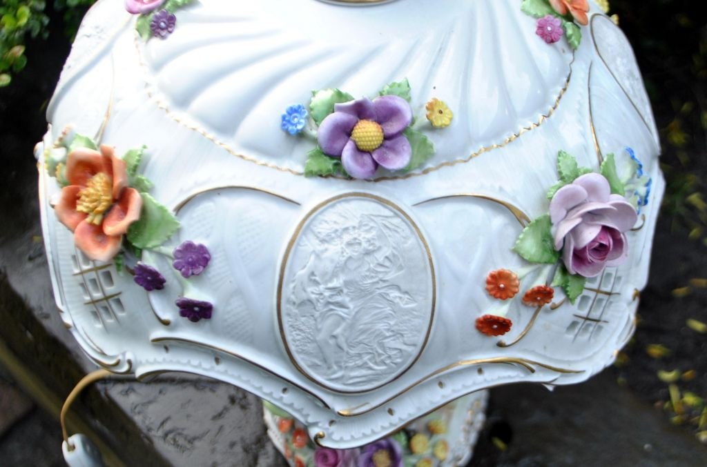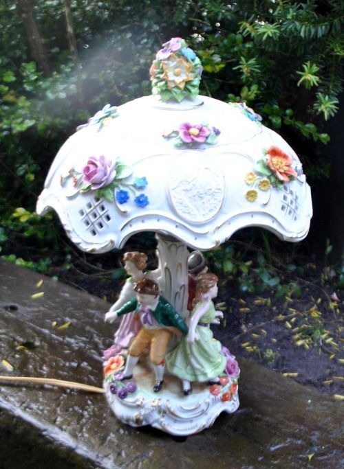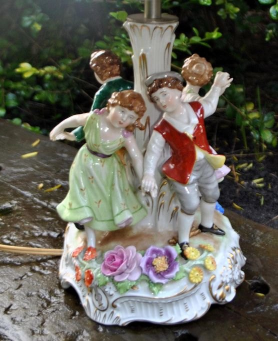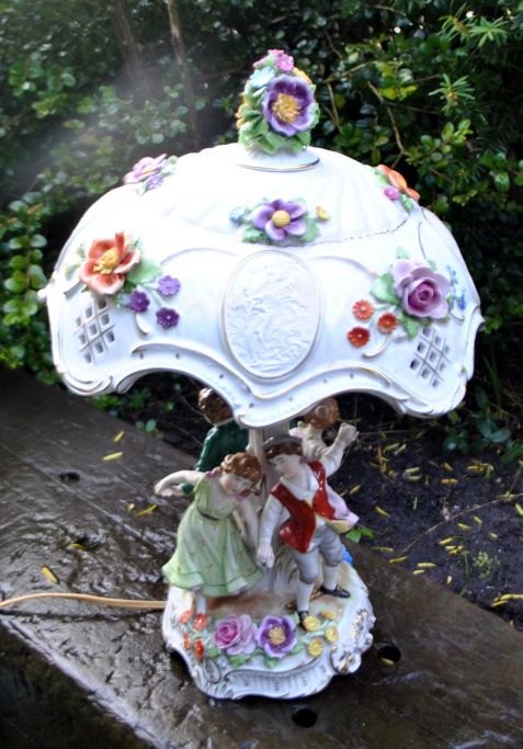 Porcelæns bordlampe, Von Schierholz'ske Porzellanmanufaktur Plau Gmbh, 1967, Tyskland. Fod med fire håndbemalede dansende børne figurer. Stamme med to elektriske lys. Skærm af porcelæn med blomsterdekorationer og 4 medeljoner i bisquit dekoreret med kvinder. Top med blomster. Med talrige forgyldninger. Stemplet. H: 44 cm. Dia.: 29 cm.