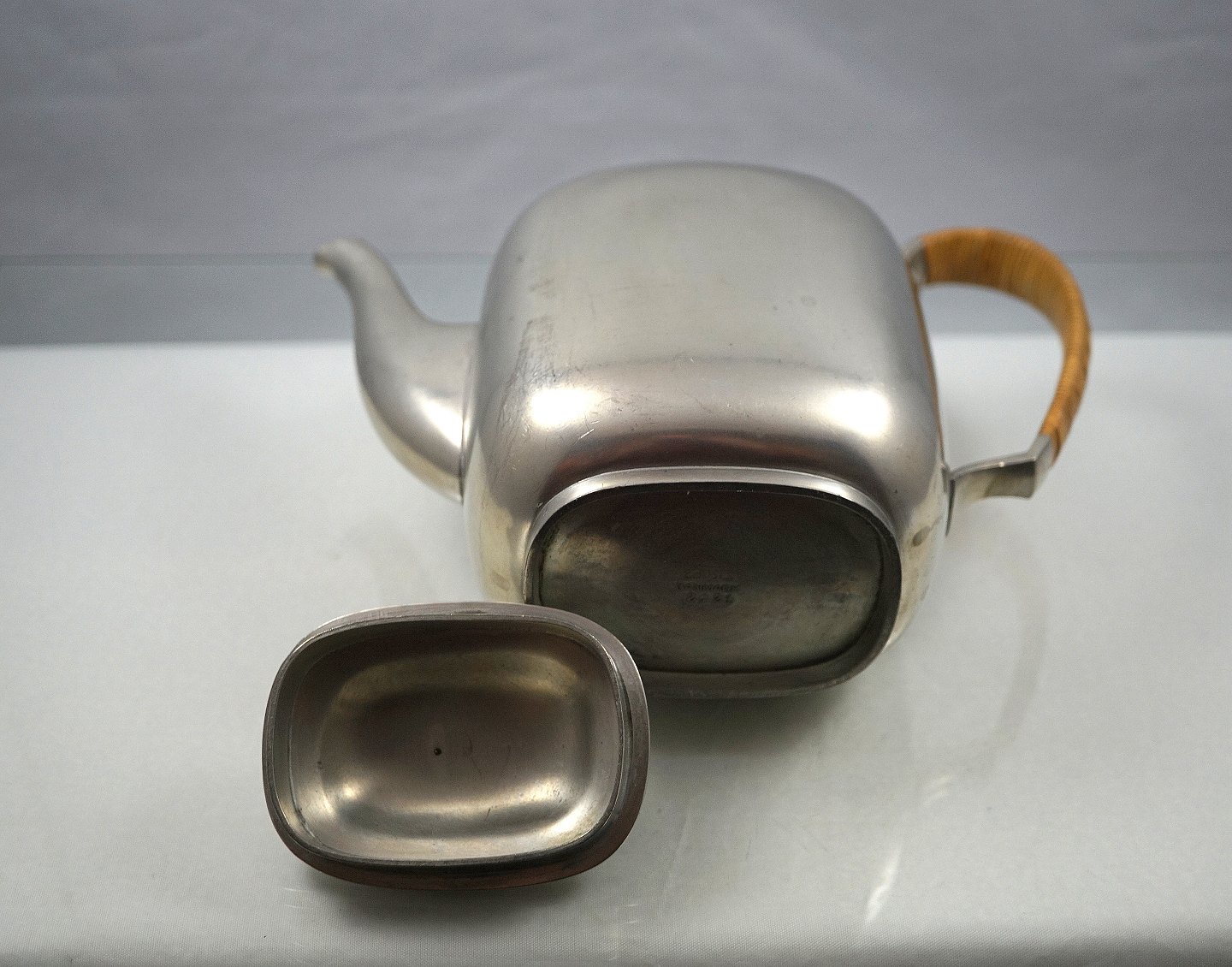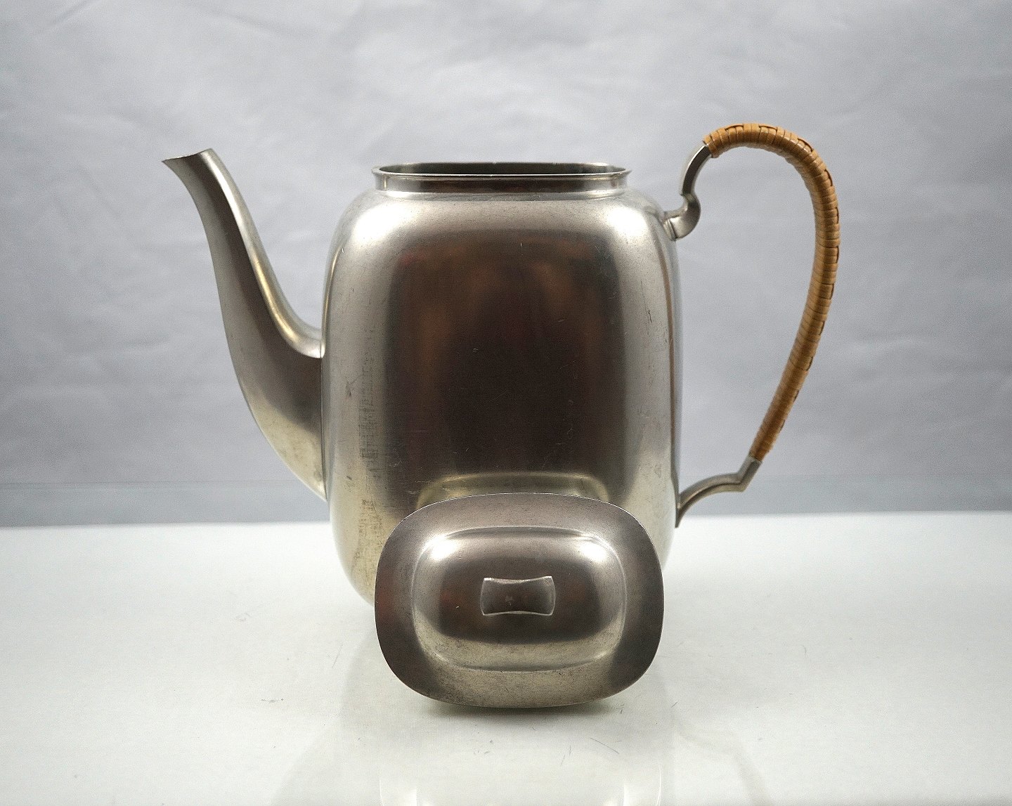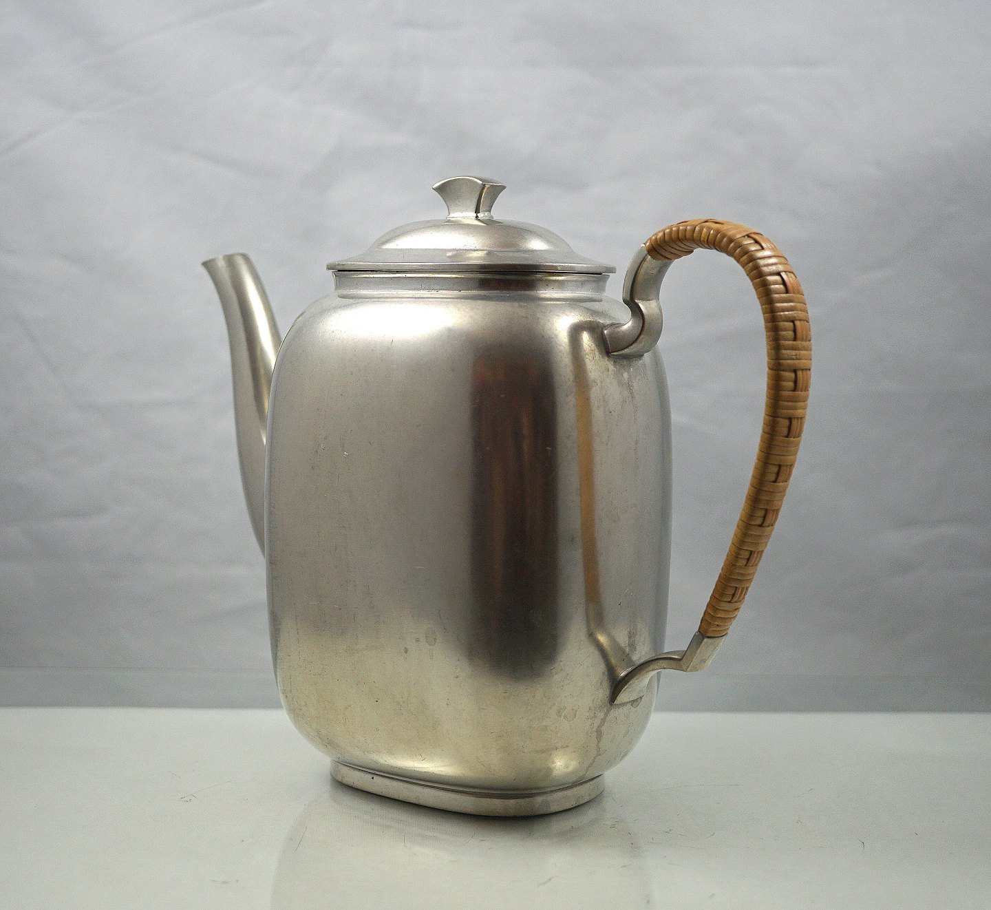 Art Deco kaffekande nr. 2421 udført i tin, med original flethank. Kanden er stemplet Just, modelnr. 2421.