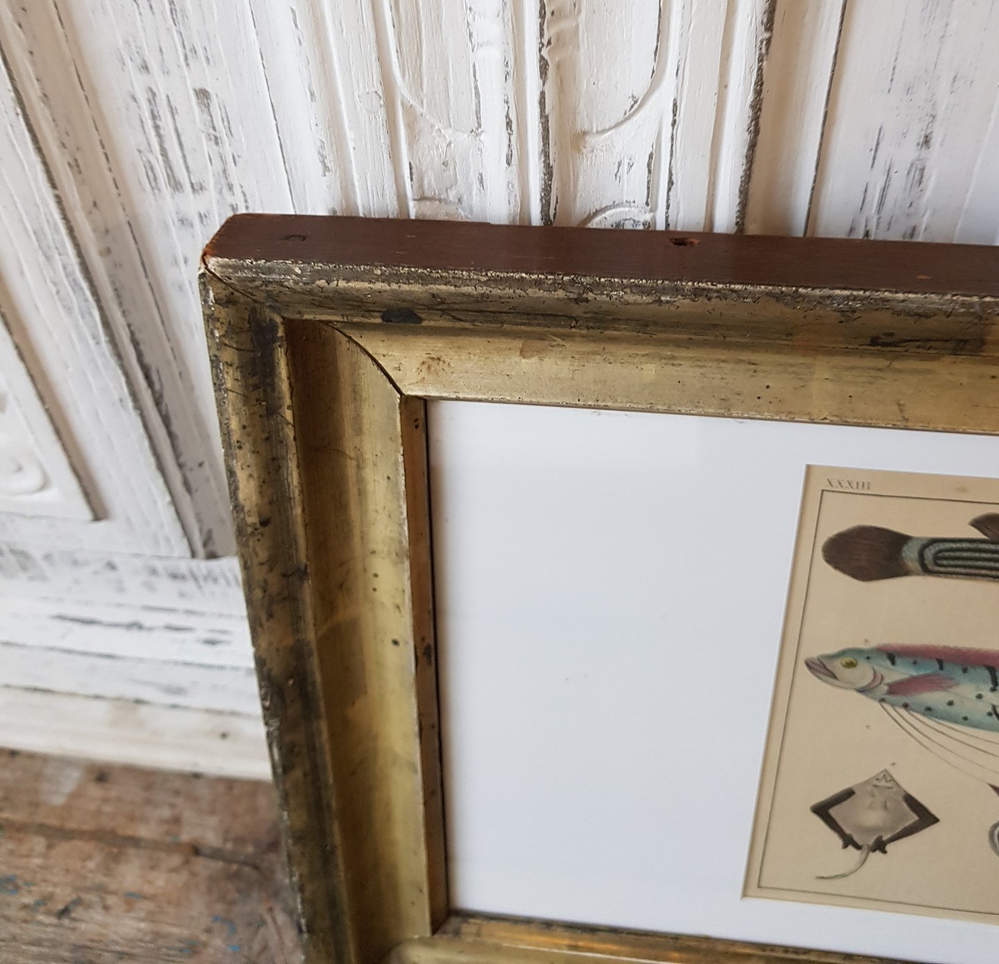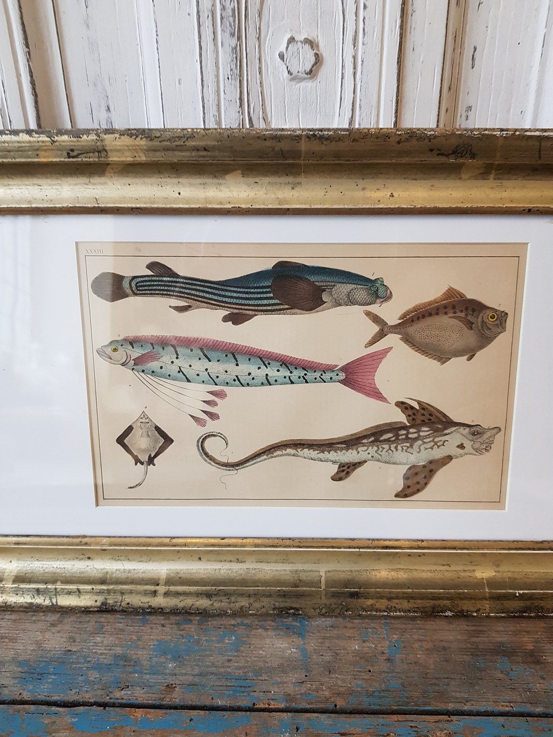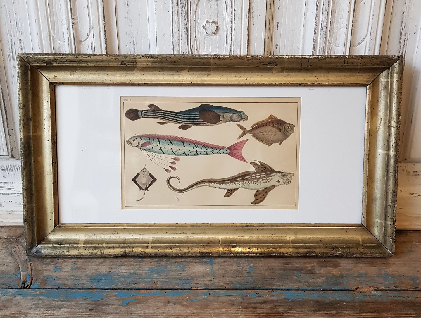 1800tals håndkoloreret tryk med fisk i smuk gammel sølvramme.