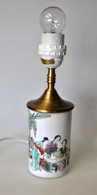 Kineisk penselbæger, 19. årh. Omlavet til et lampe. Hvidt porcelæn med dekorationer i form af kvinder og barn. Med tekst. H.: 13 cm. Højde med el: 25 cm.