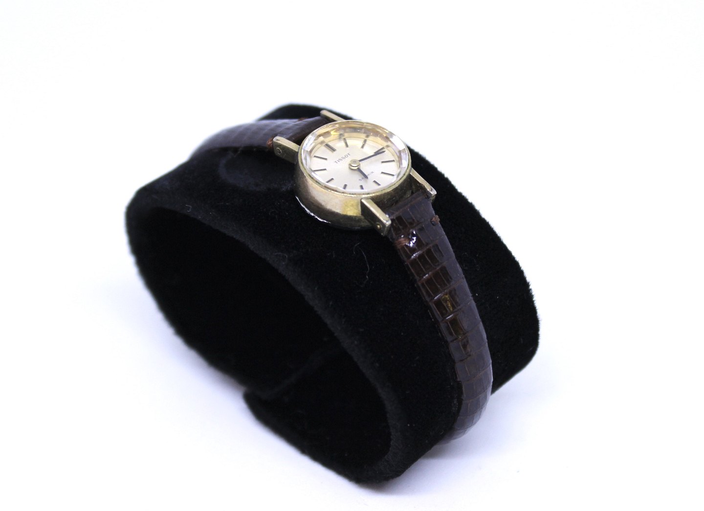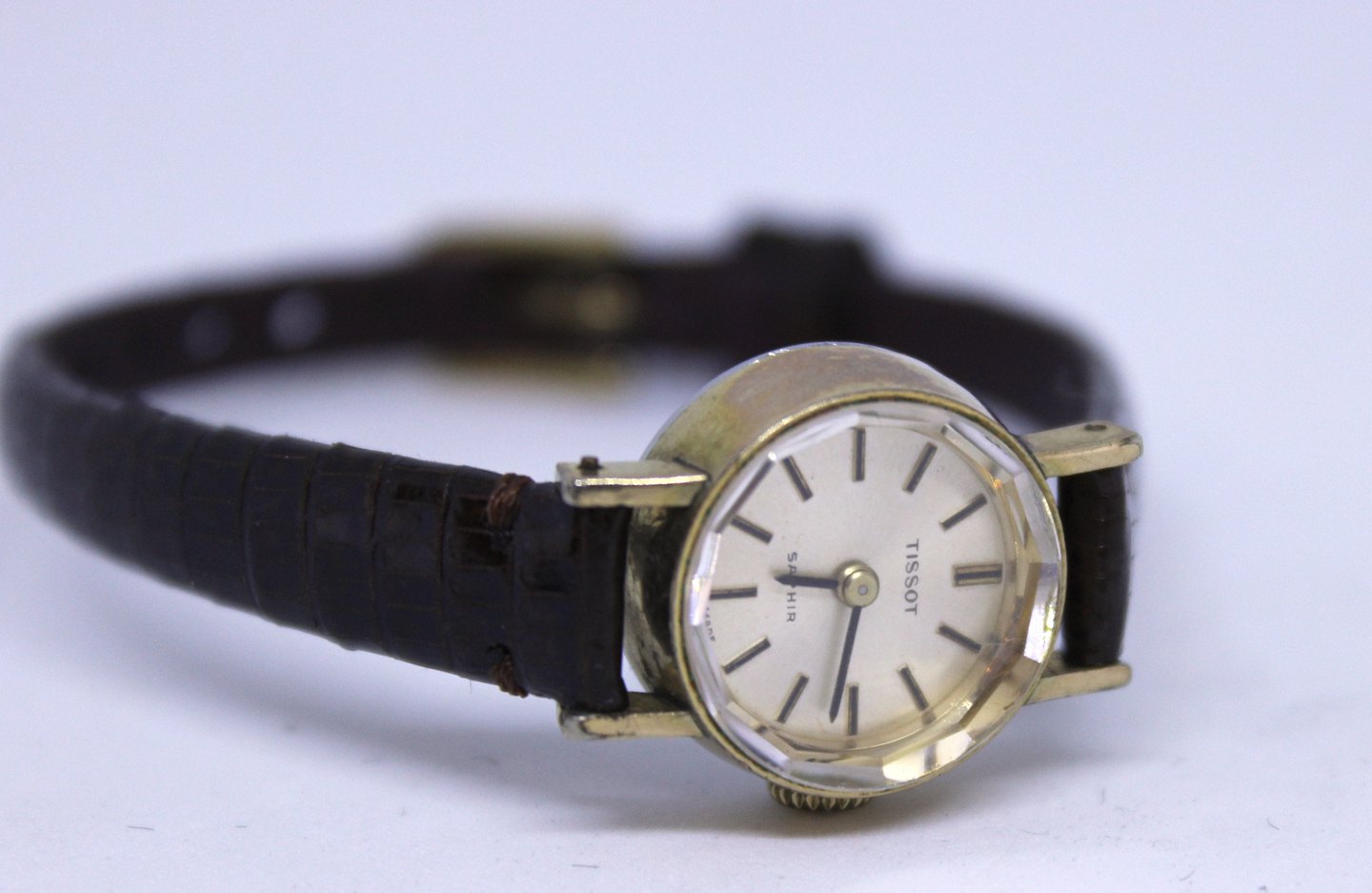 Tissot Saphir forgyldt dameur med schweizisk urværk og krokodille læder rem. Uret er i flot brugt stand og urkassen er af dublé.