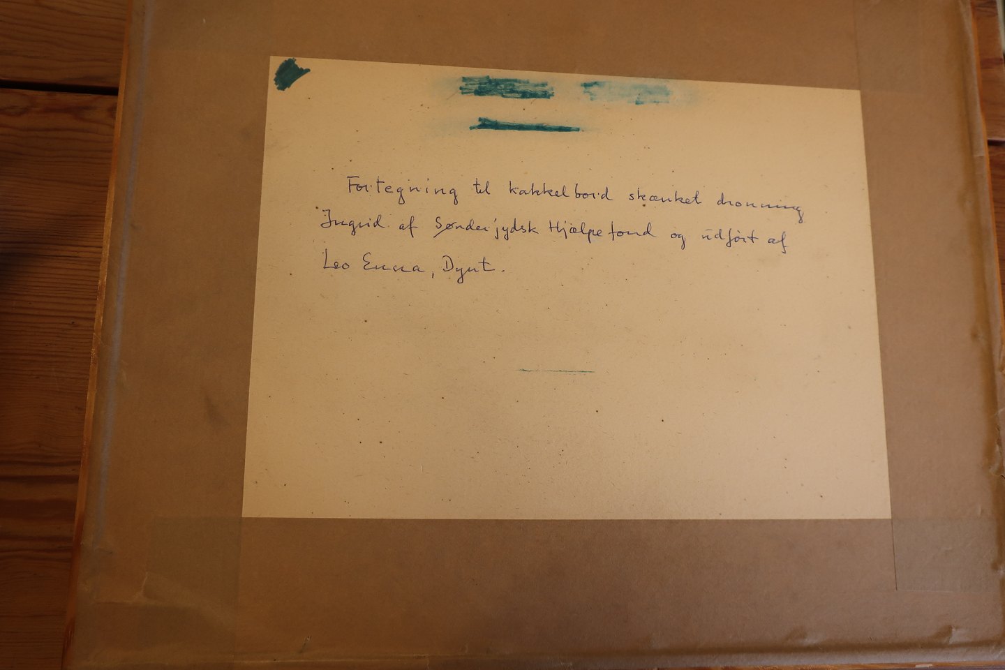 Indskrift på bagsiden: "Fortegning til kakkelbord skænket dronning Ingrid af Sønderjydsk Hjælpefond og udført af Leo Enna, Dynt"