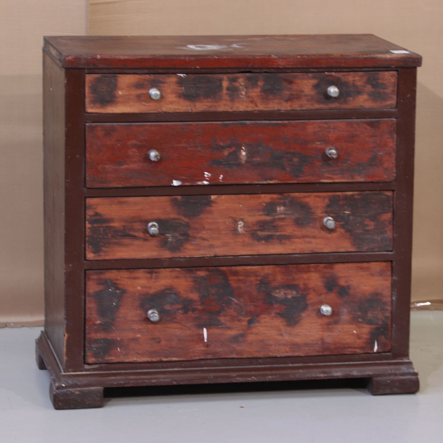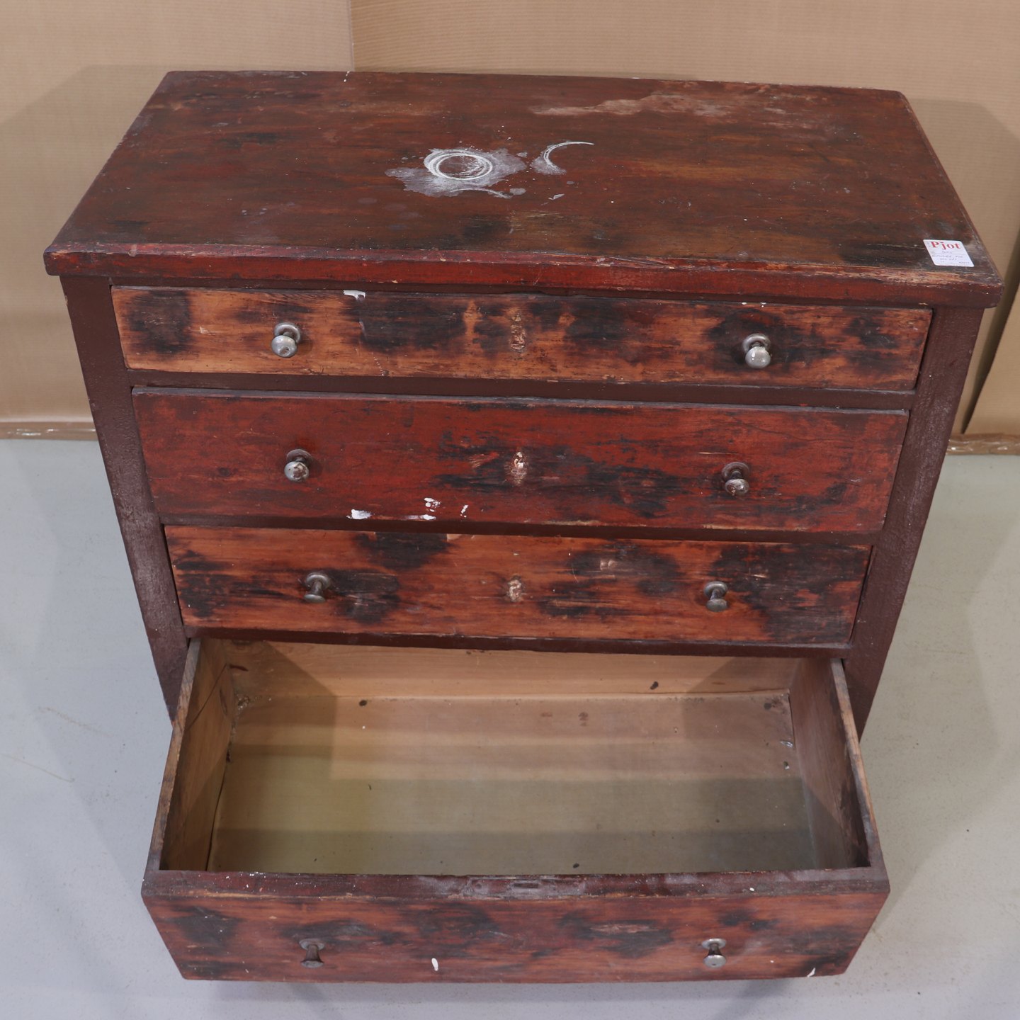 Kommode i bejdset fyrretræ m. 4 skuffer, OBS diverse defekter,
