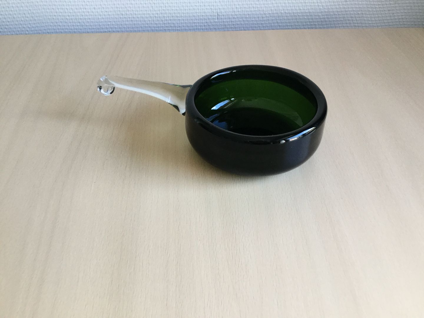 Transparent jadegrøn skål med klar hank.