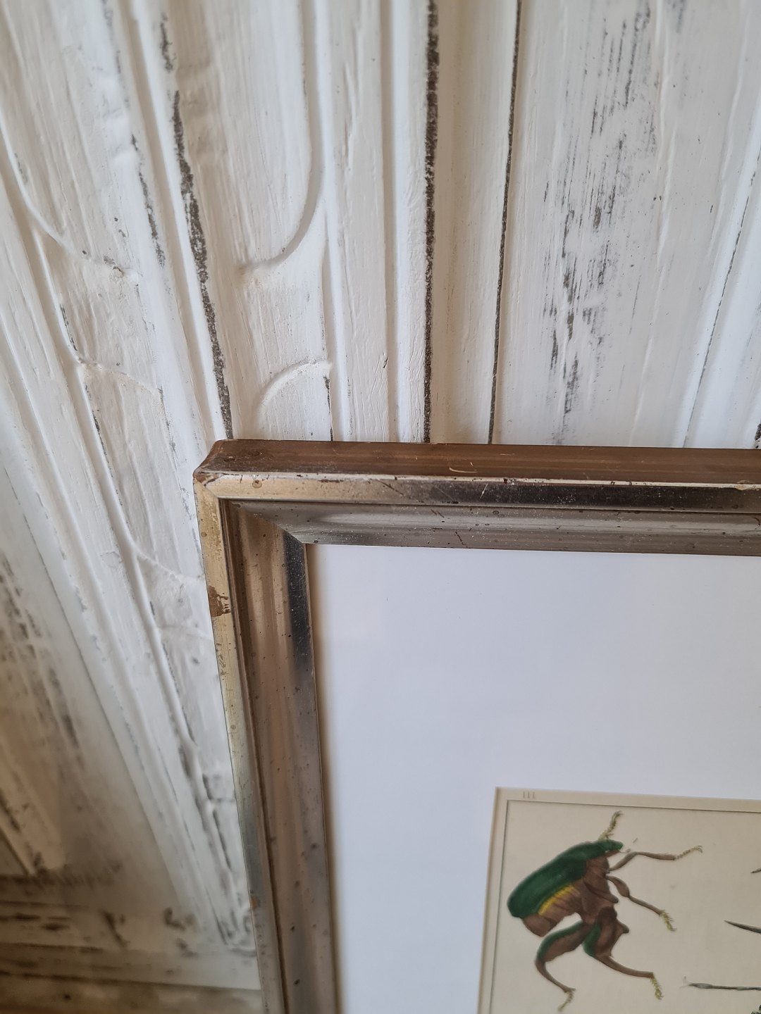 1800s hand-colored print with scarab in beautiful simple silver frame.
