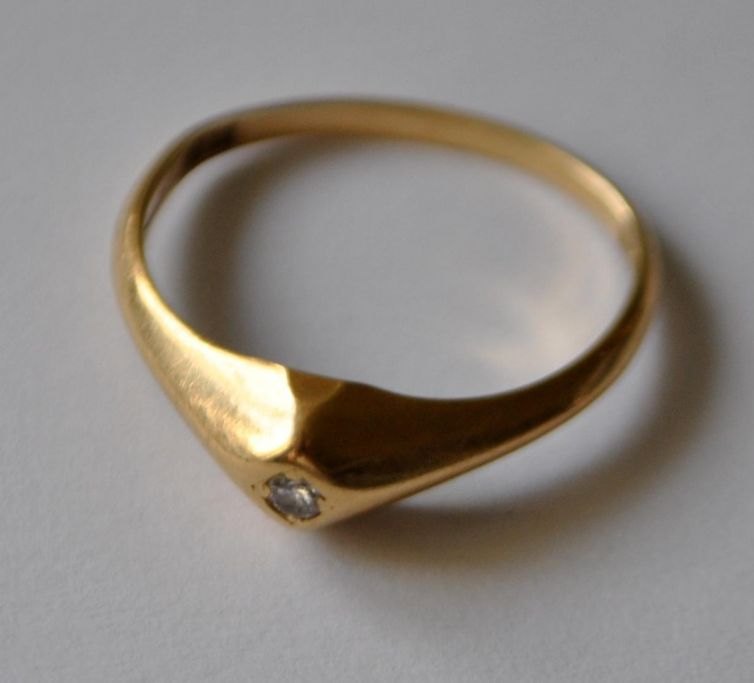 14 karat guld ring med brillant, 20. årh. Danmark. Stemplet: SH. Størrelse: 52. Vægt: 1,4 gram. Brillant slebet, 1/16 karat.
