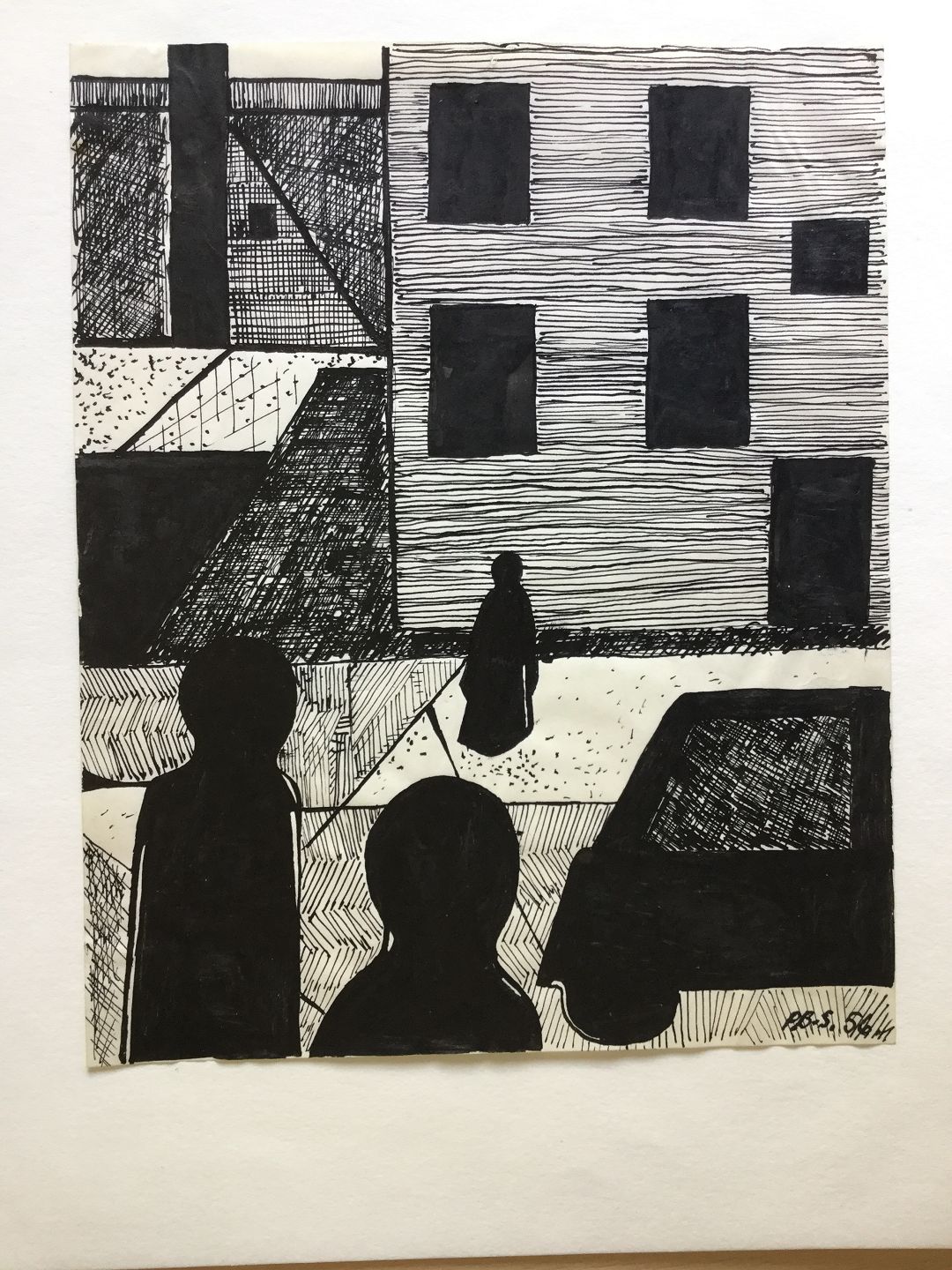 Tegning af Peder Brøndum Sørensen - 3 personer og bil ved højhuse 1956.