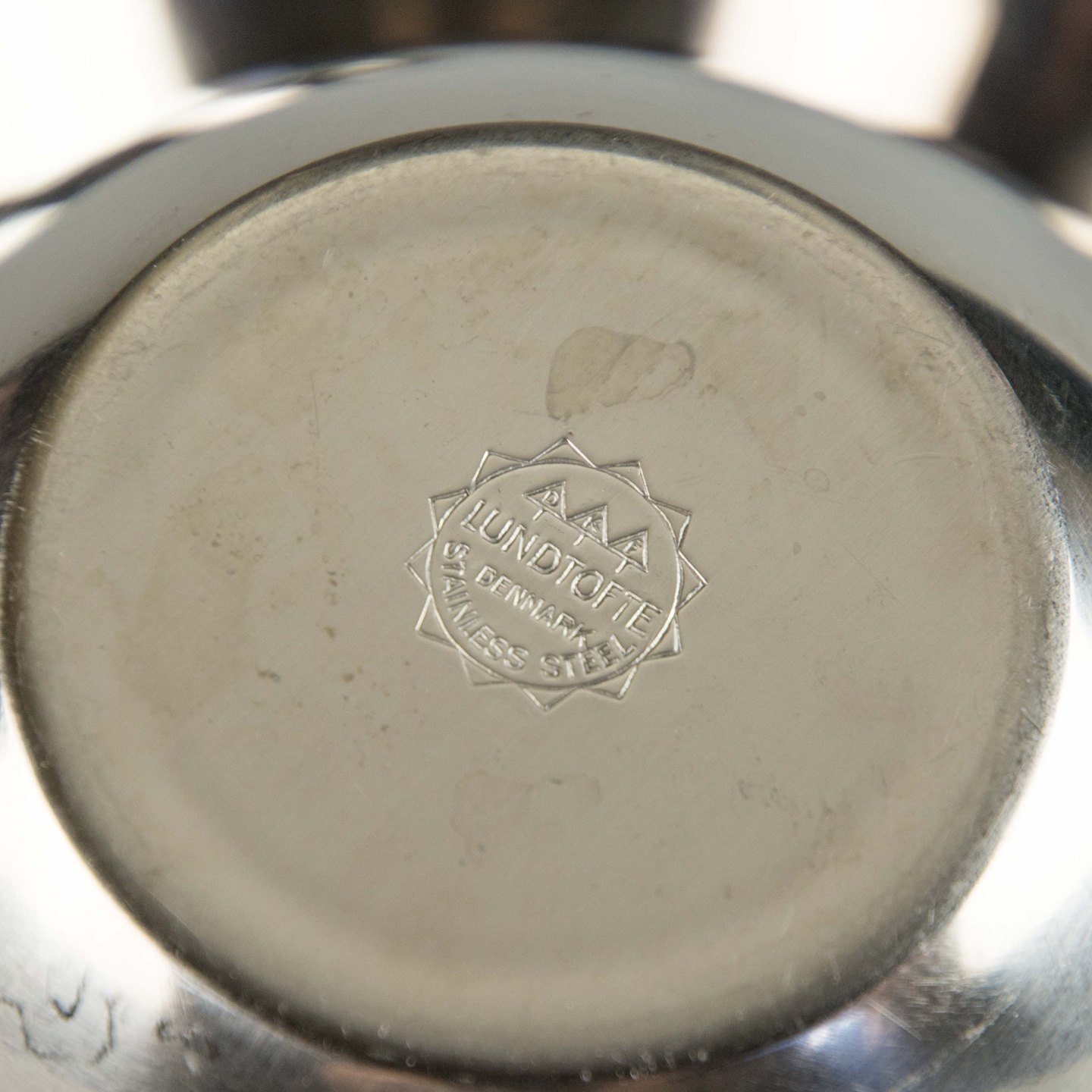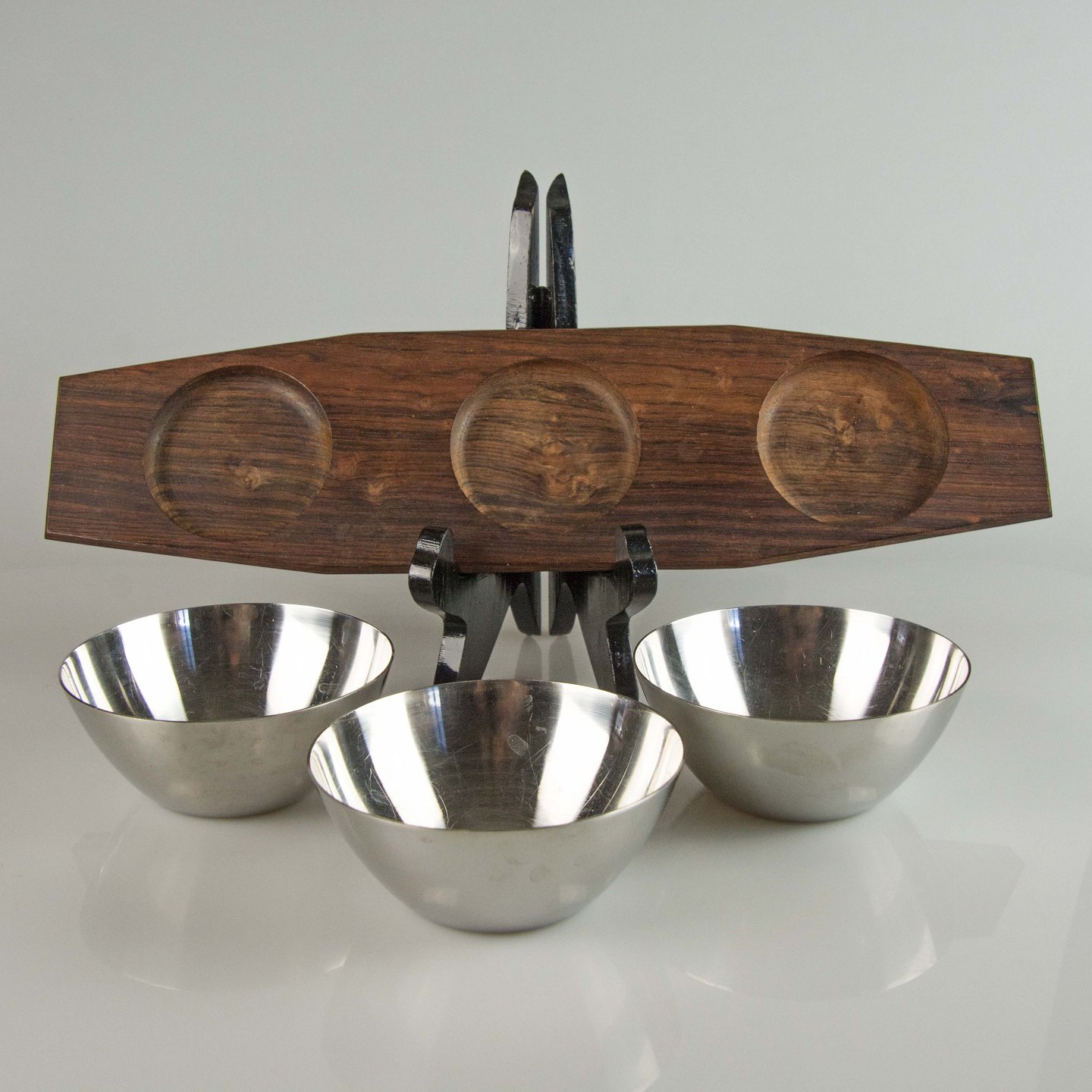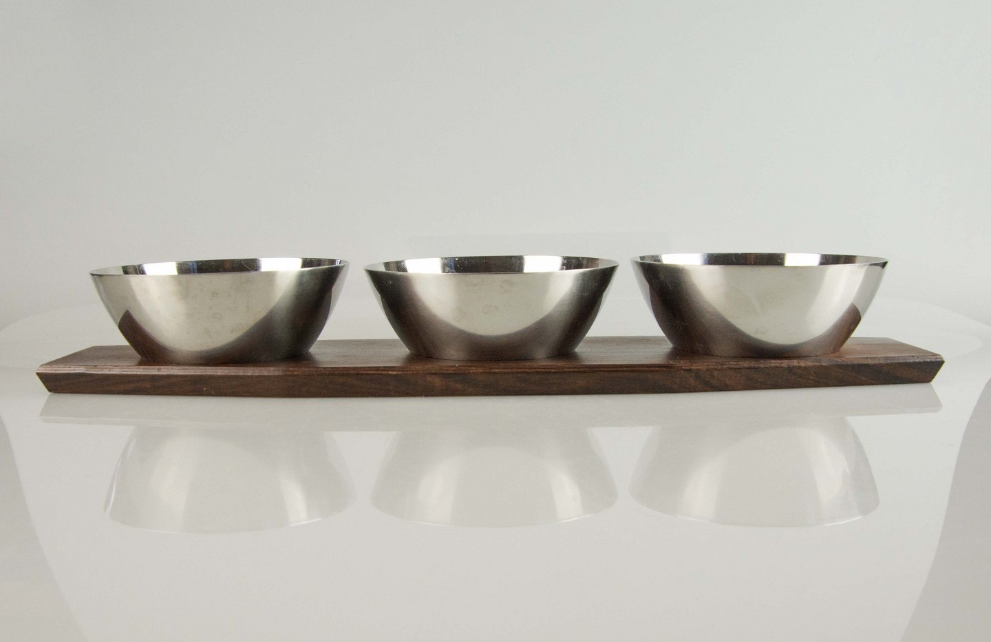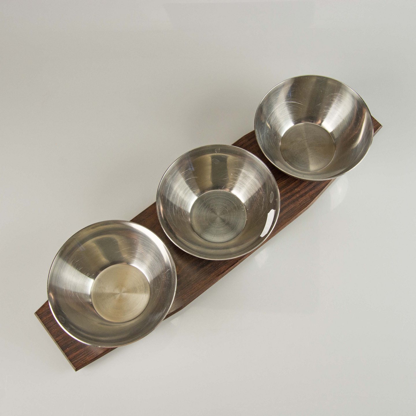 Tapas sæt bestående af tre skåle i rustfrit stål på bræt af palisandertræ.