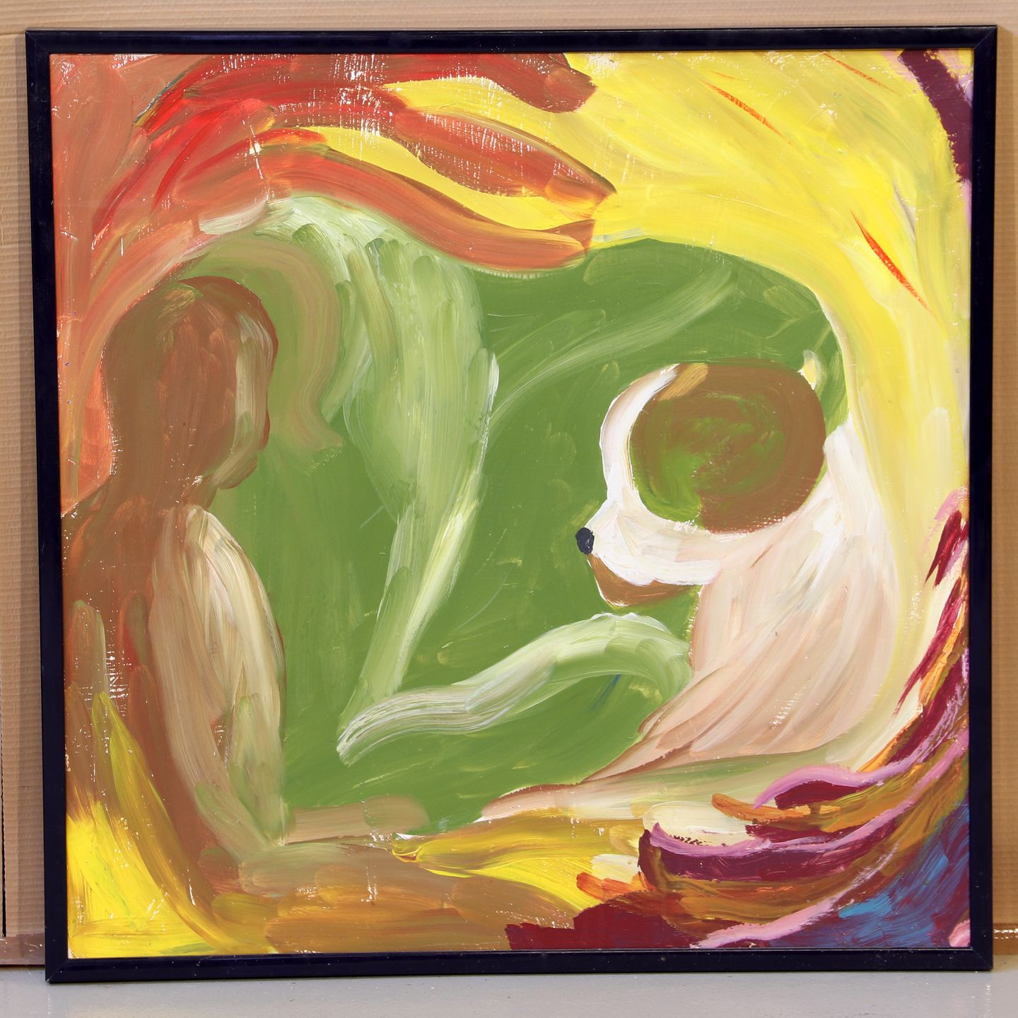 Person og hund, olie på lærred i malet ramme, (HxB 84x84 cm), usigneret