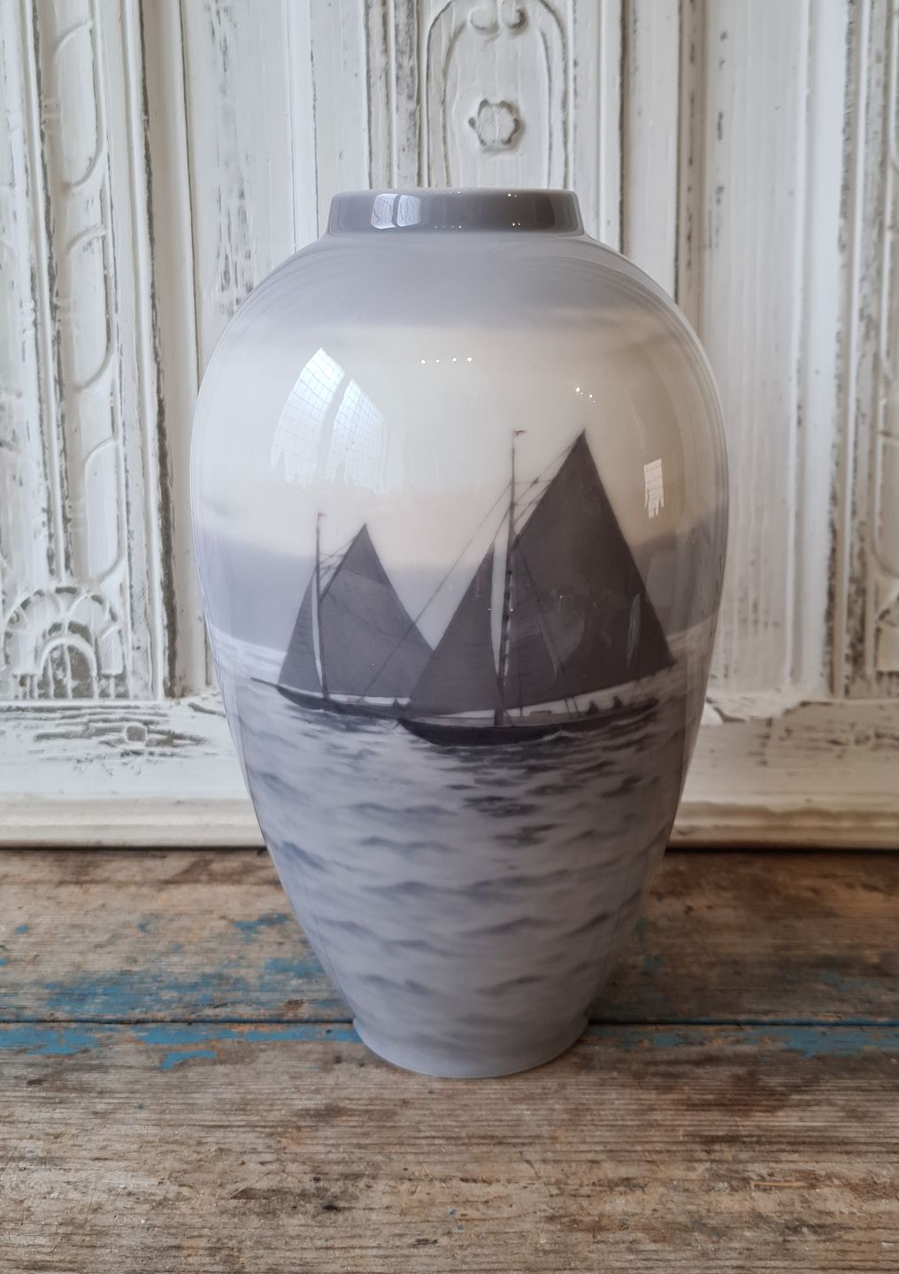 Royal Copenhagen Art Nouveau vase dekoreret med sejlskibe