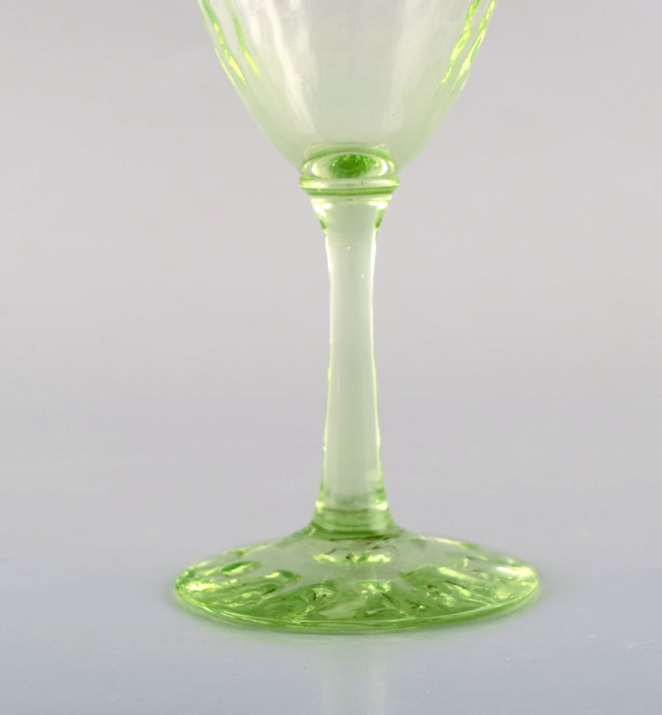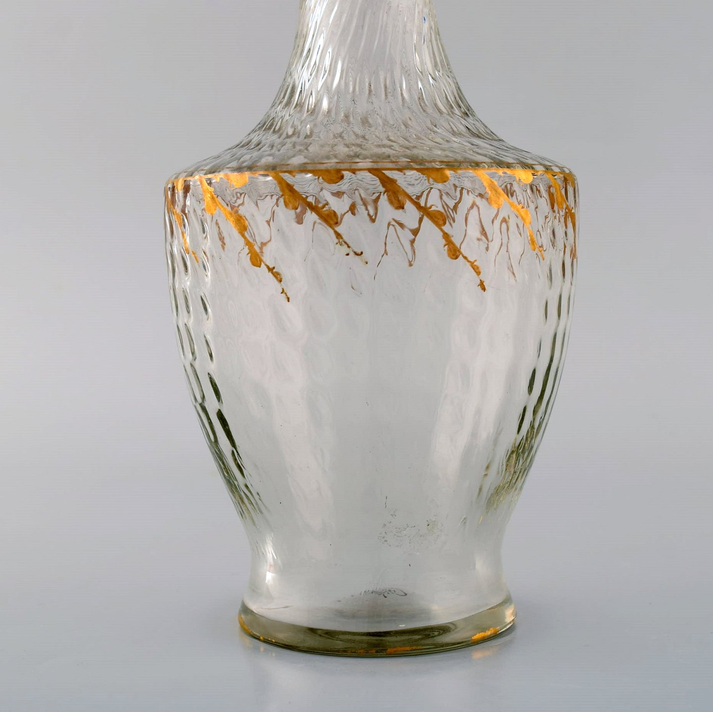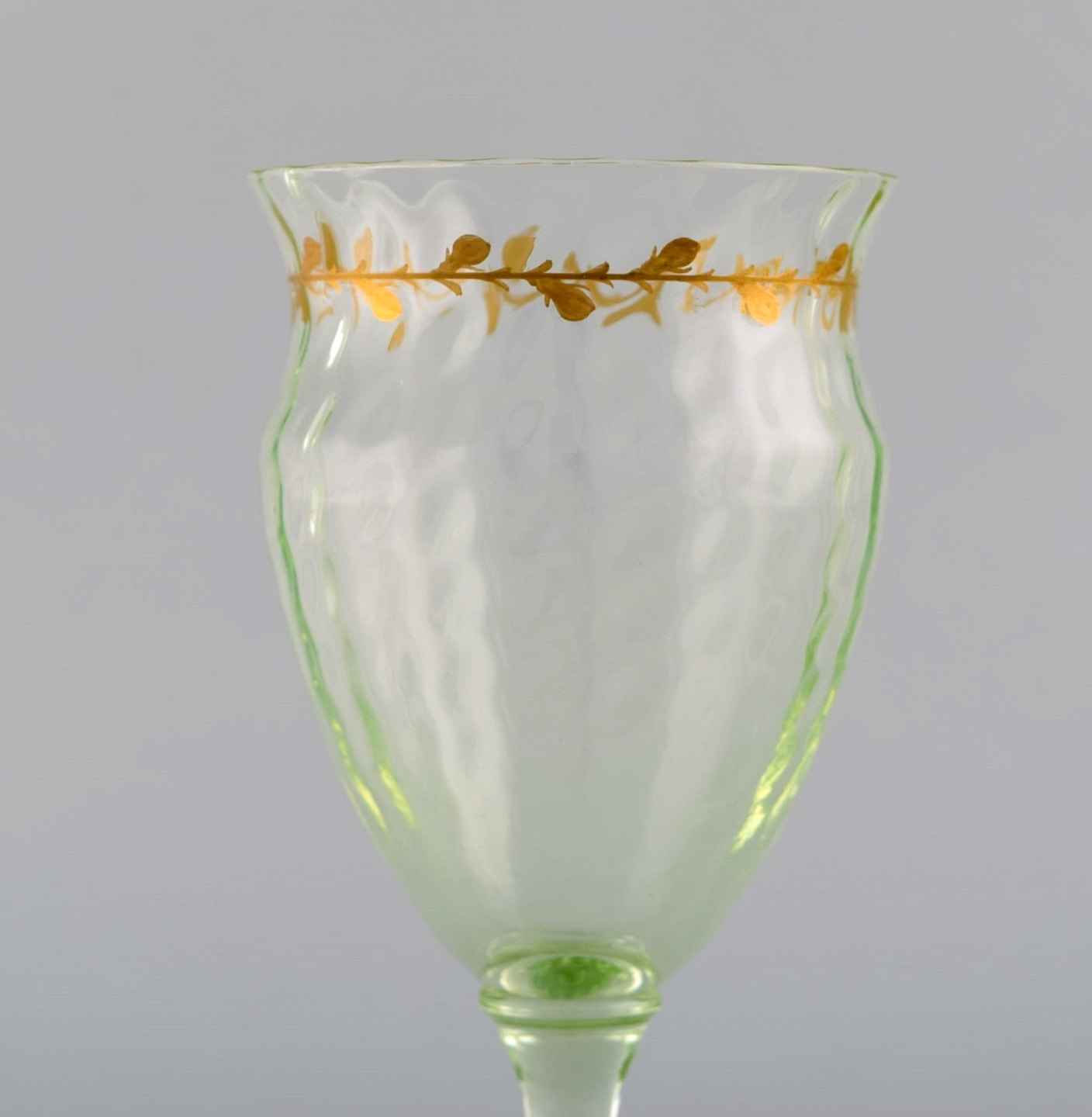 Emile Gallé (1846-1904). Six early and rare wine glasses and carafe in mouth-blown light green art glass with hand-painted gold decorations in the form of leaves. Museum quality, 1870s / 80s.