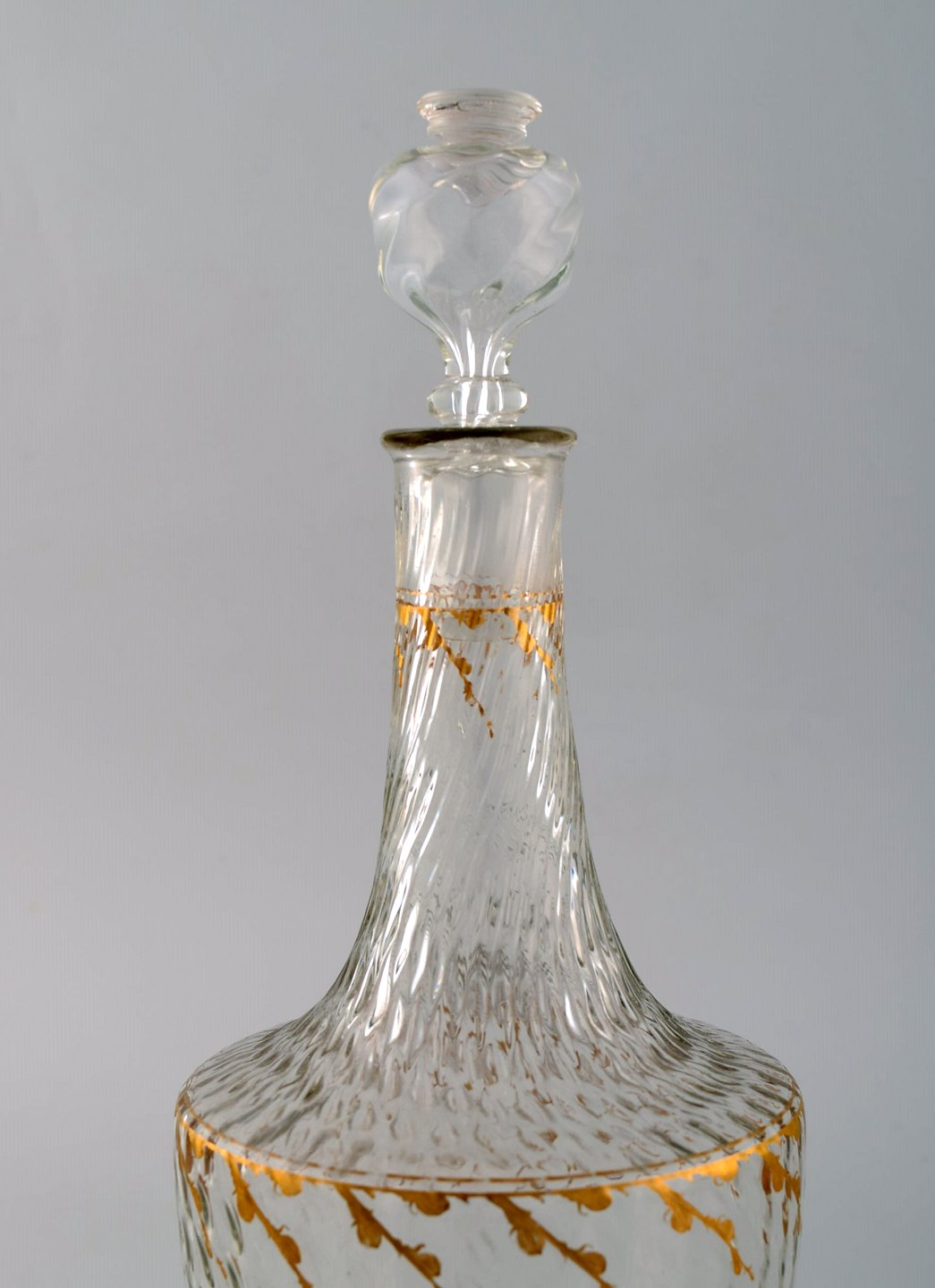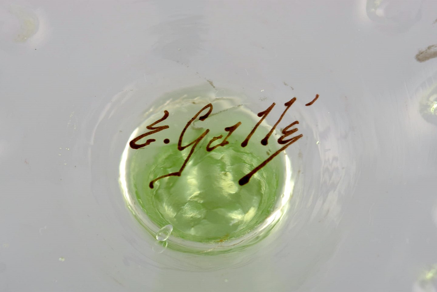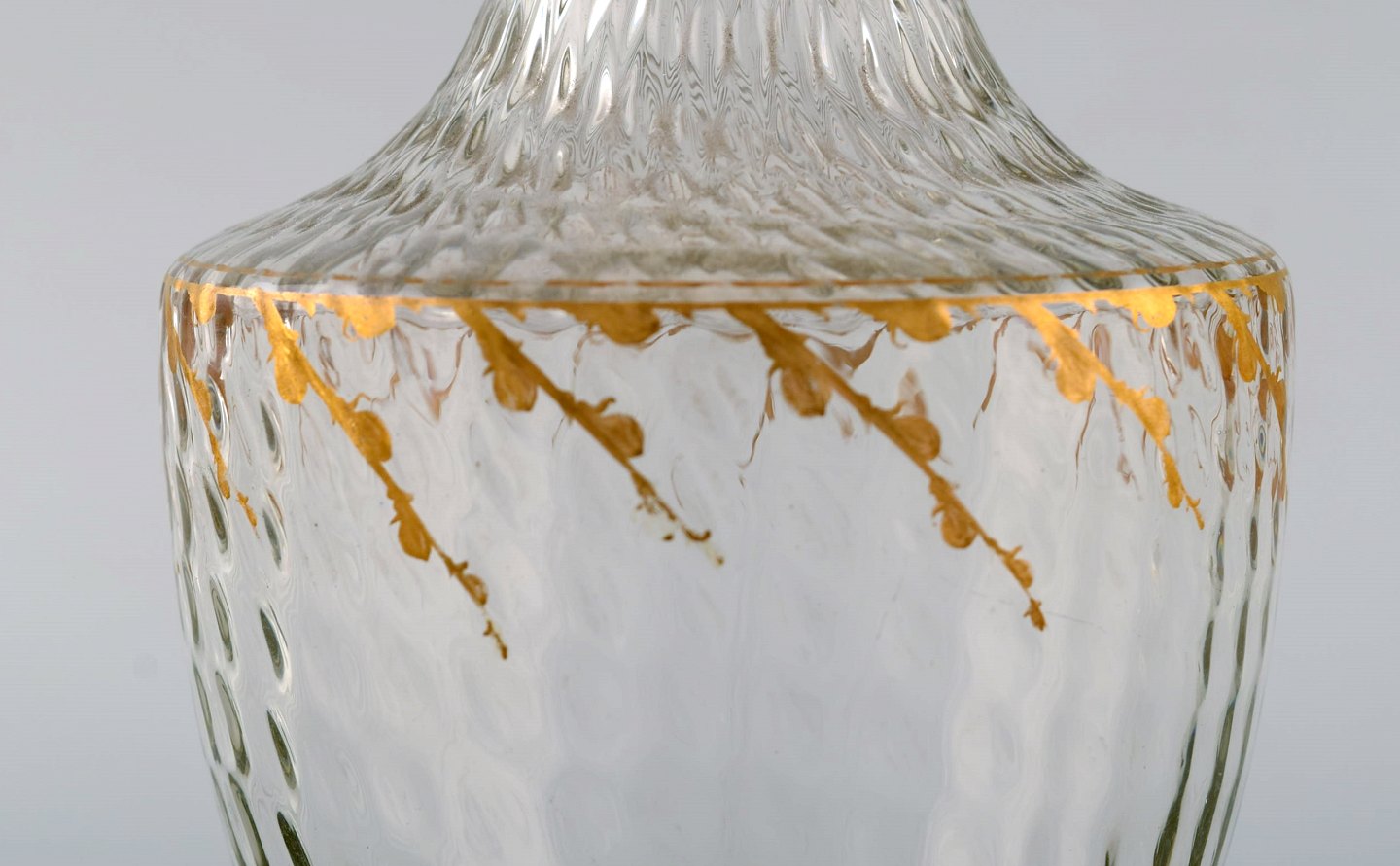 Emile Gallé (1846-1904). Six early and rare wine glasses and carafe in mouth-blown light green art glass with hand-painted gold decorations in the form of leaves. Museum quality, 1870s / 80s.
