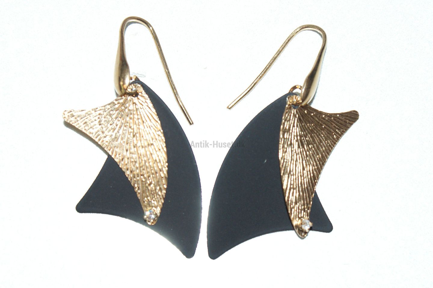Et smukt forgyldt blad med en cz-sten, der glider ned over et sort emaljeret blad.