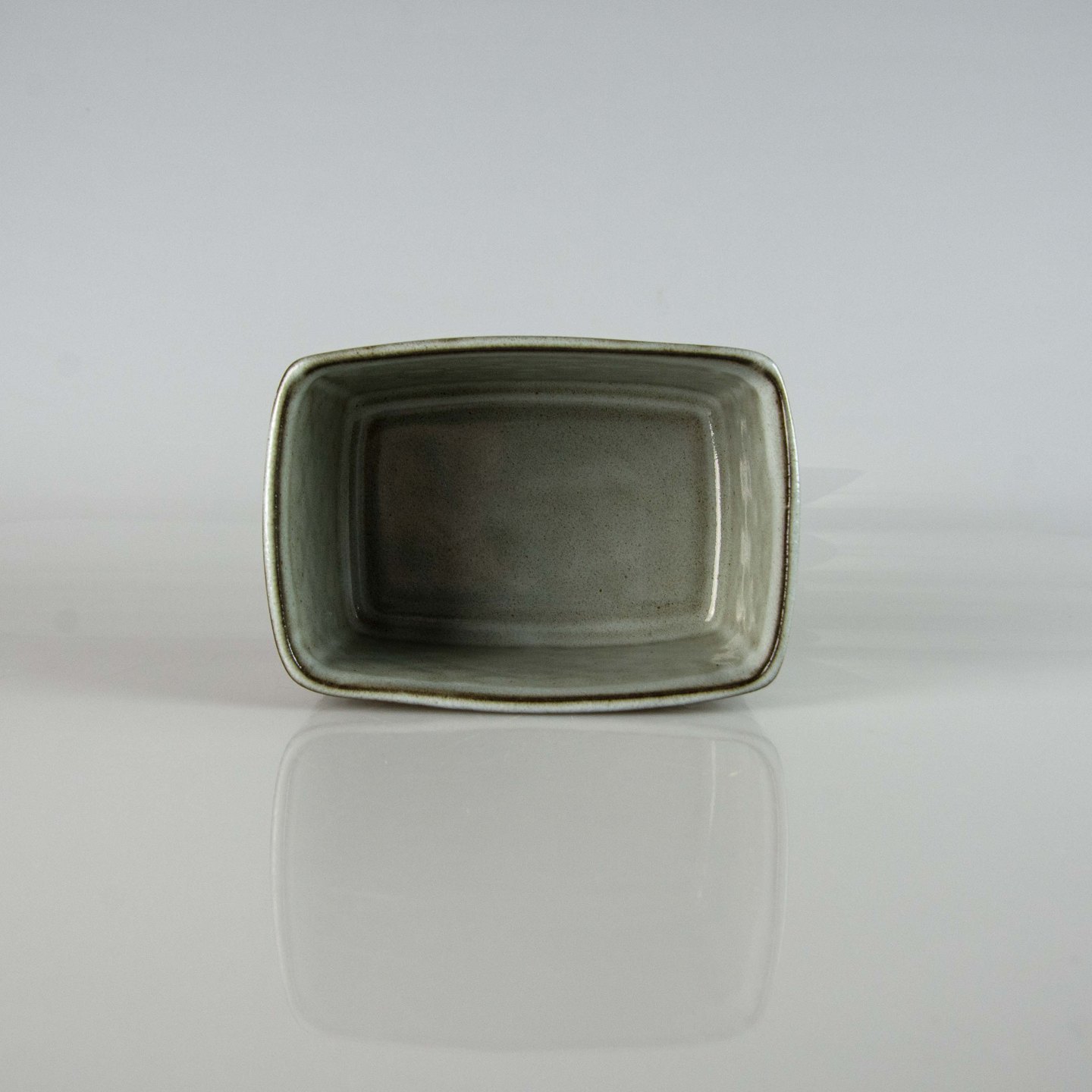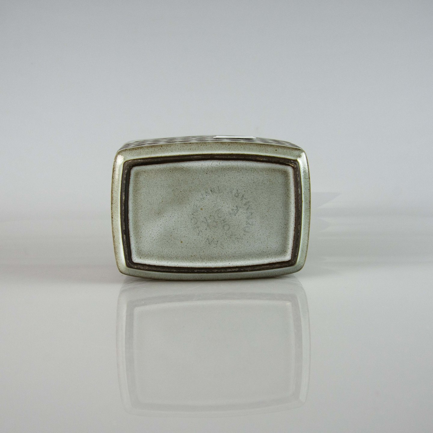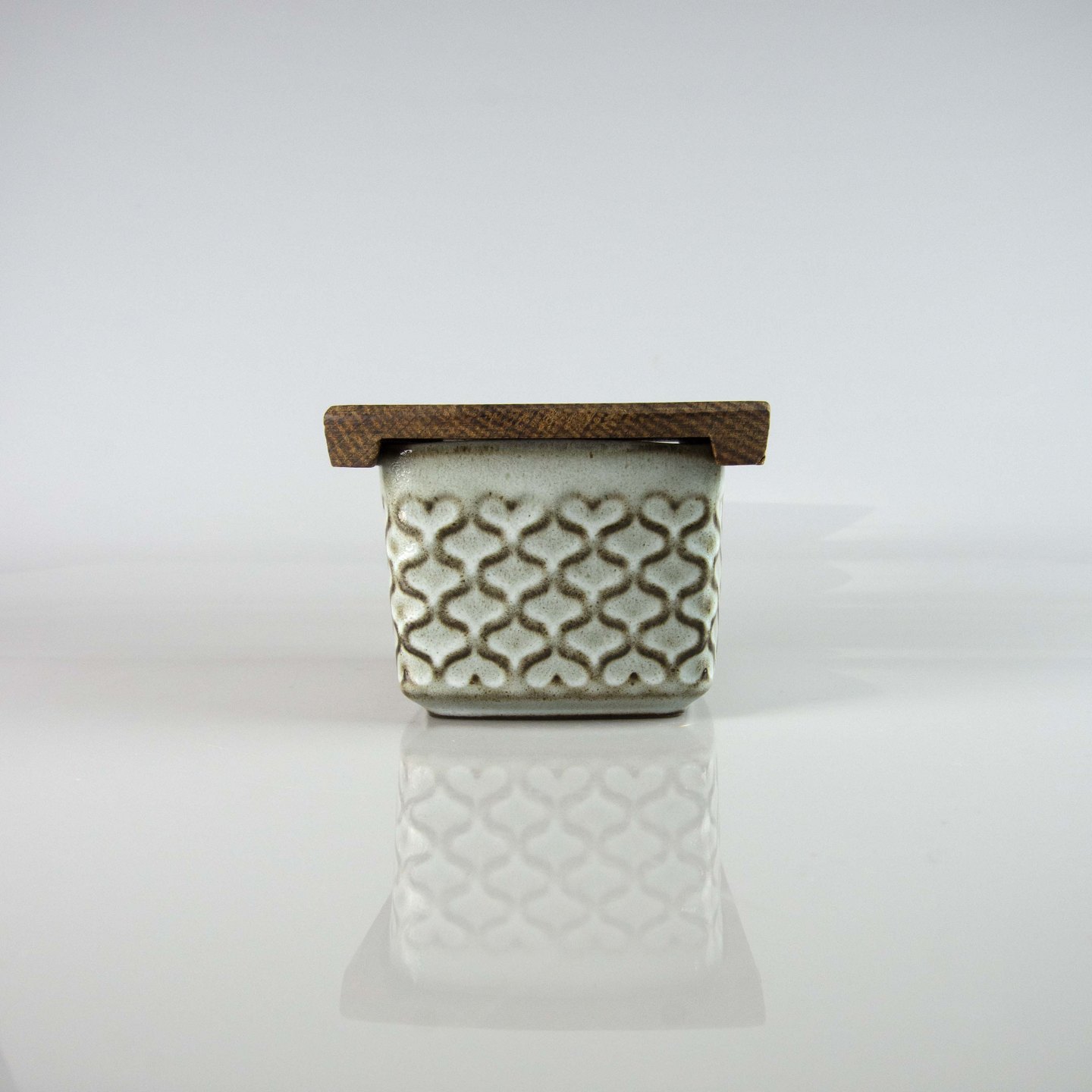 Text available in Danish: Smørboks i stentøj med trælåg fra stellet Grå cordial