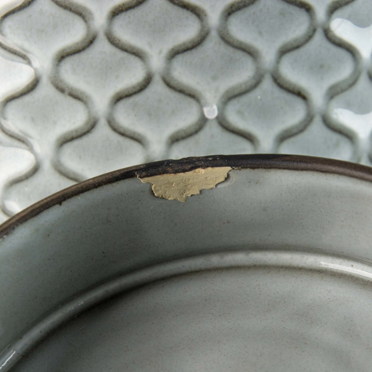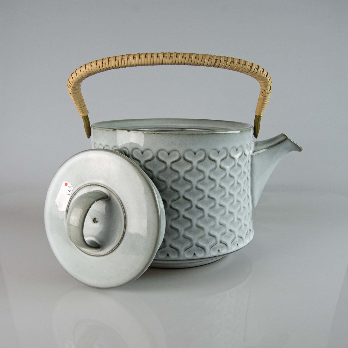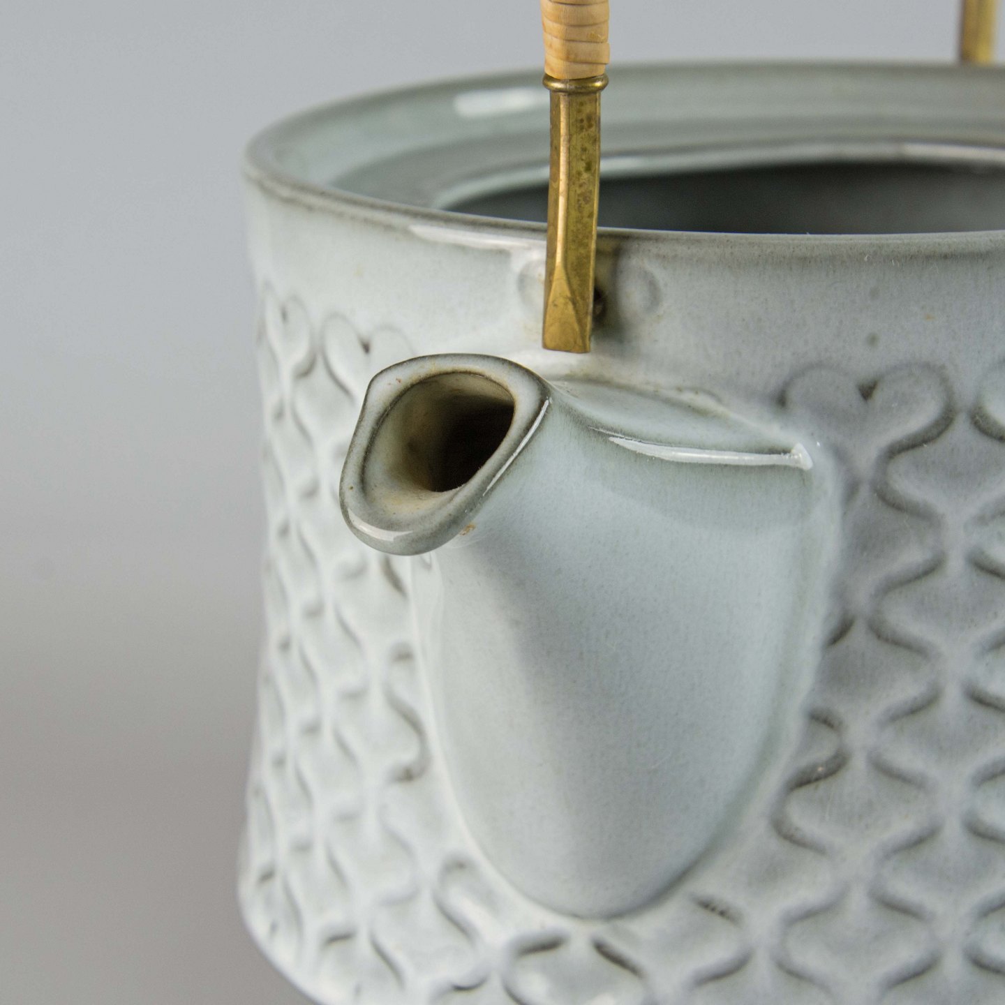 Kande i gråt stentøj med abstrakt motiv.