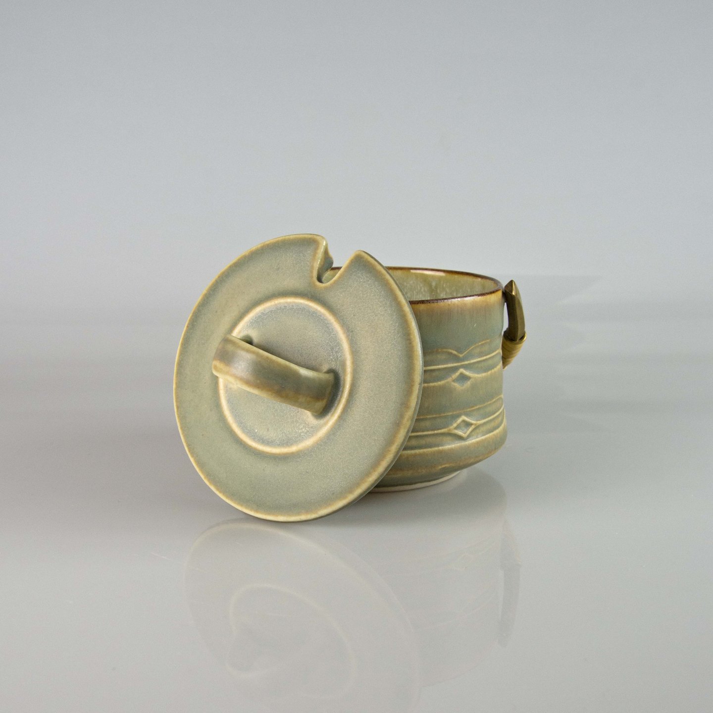 Lågkrukke i grøn stentøj med abstrakt motiv.