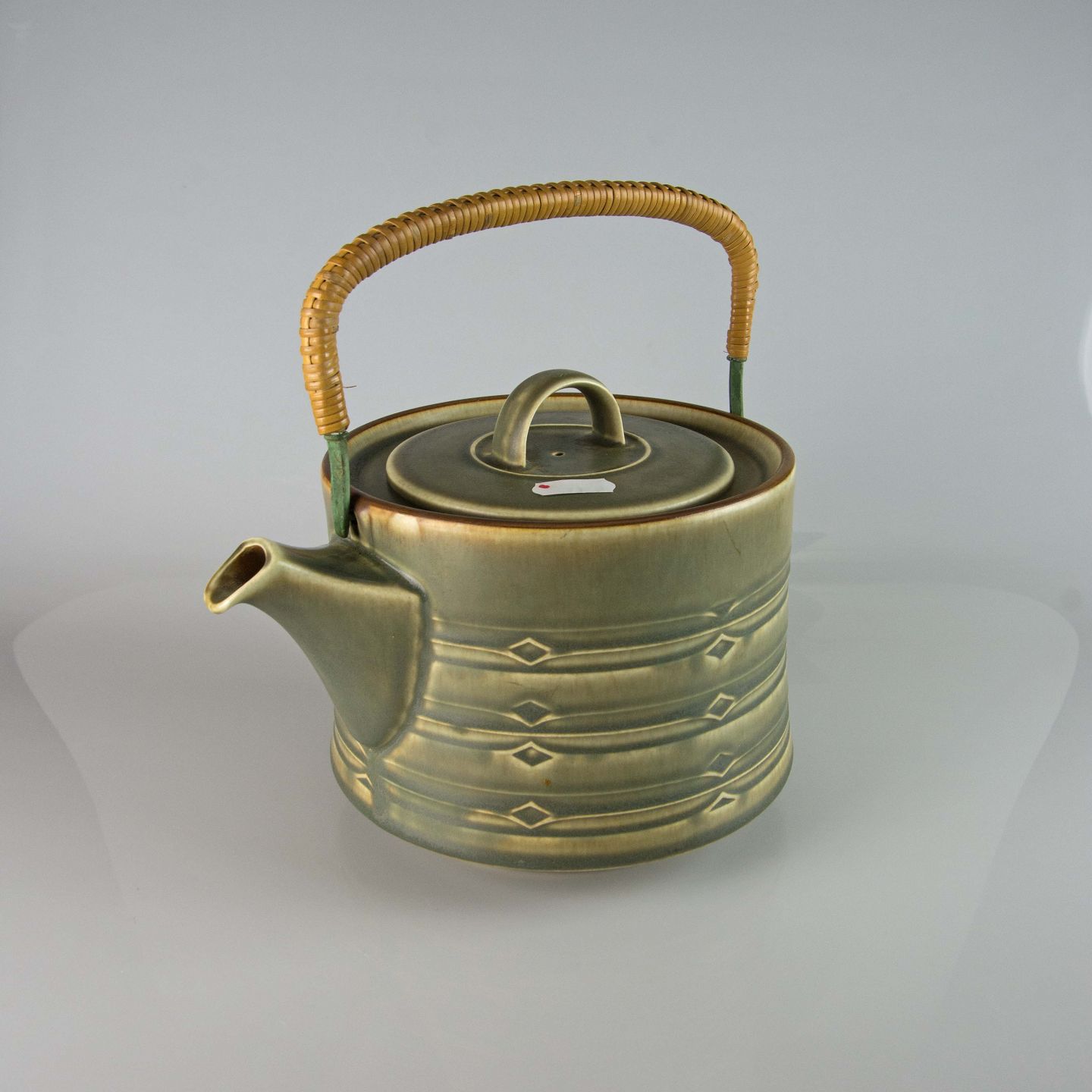 Kande i grøn stentøj med abstrakt motiv.