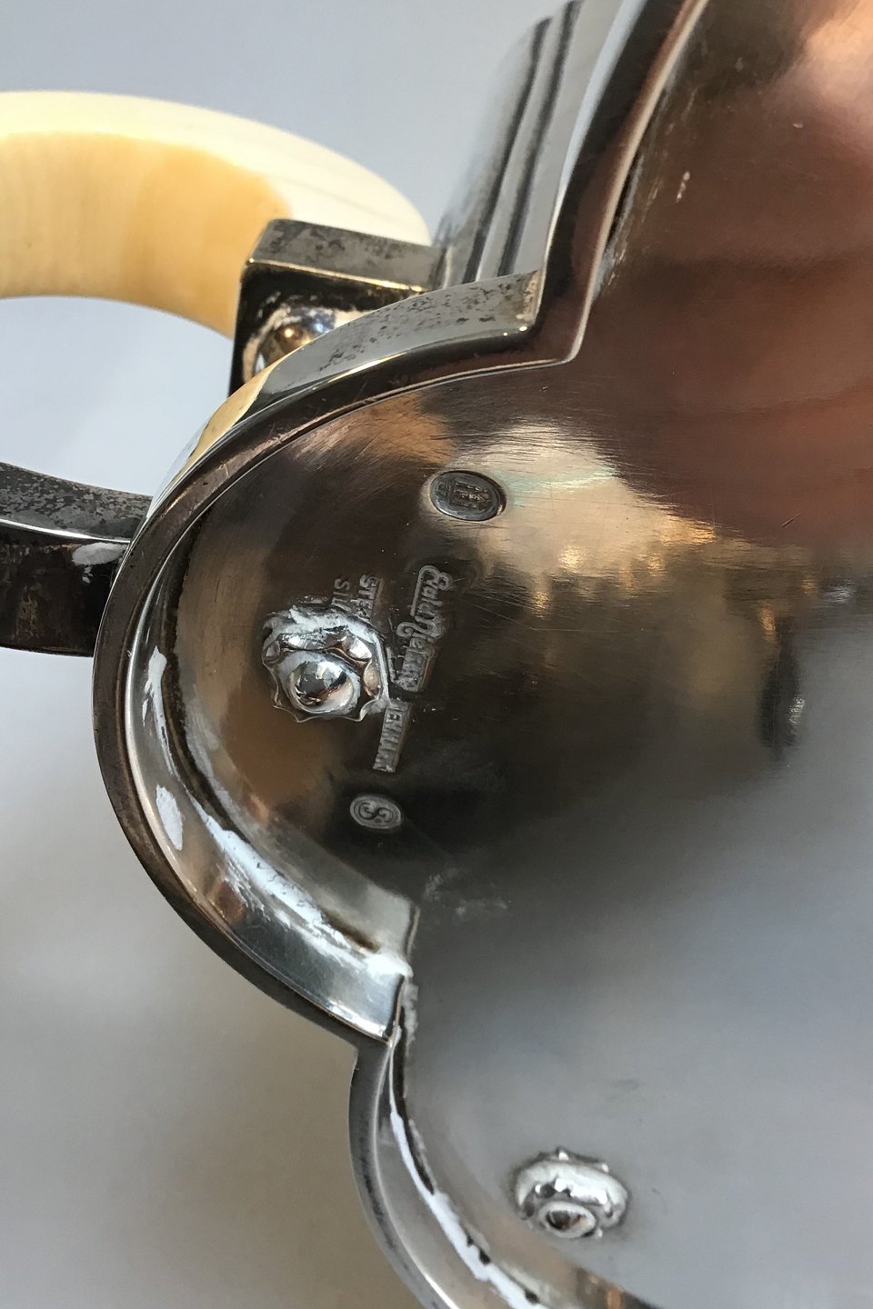 Evald Nielsen: Sølv Tobakssæt m udskåret elfenbenshank (1937)Måler 26.8 cm Vægt 1249 gr